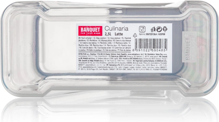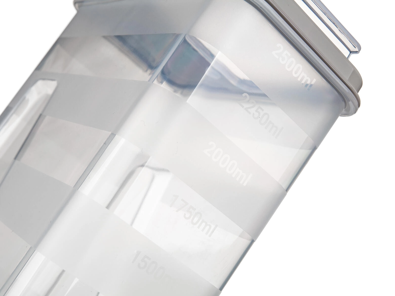 Praktiske målemarkeringer for hver 250 ml hjælper dig med at afmåle præcist til madlavning og bagning. Beholderen er robust, let at rengøre og dens slanke, høje form sparer effektivt plads på hylderne.