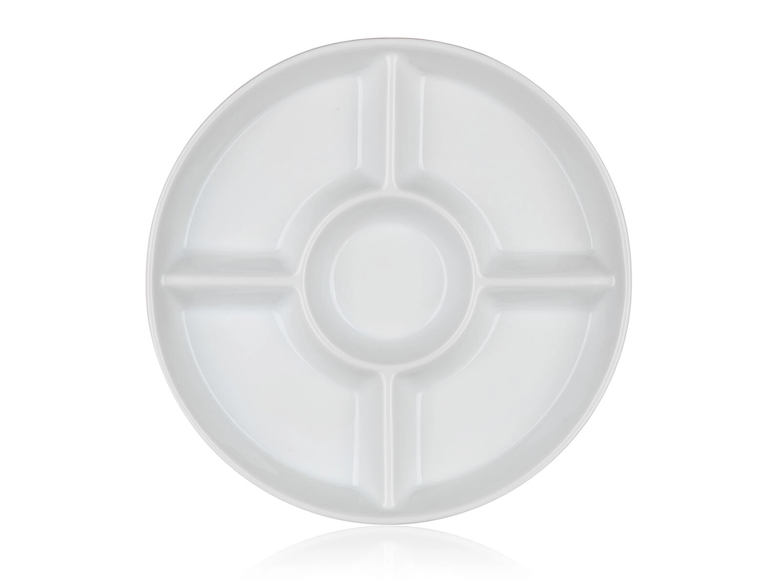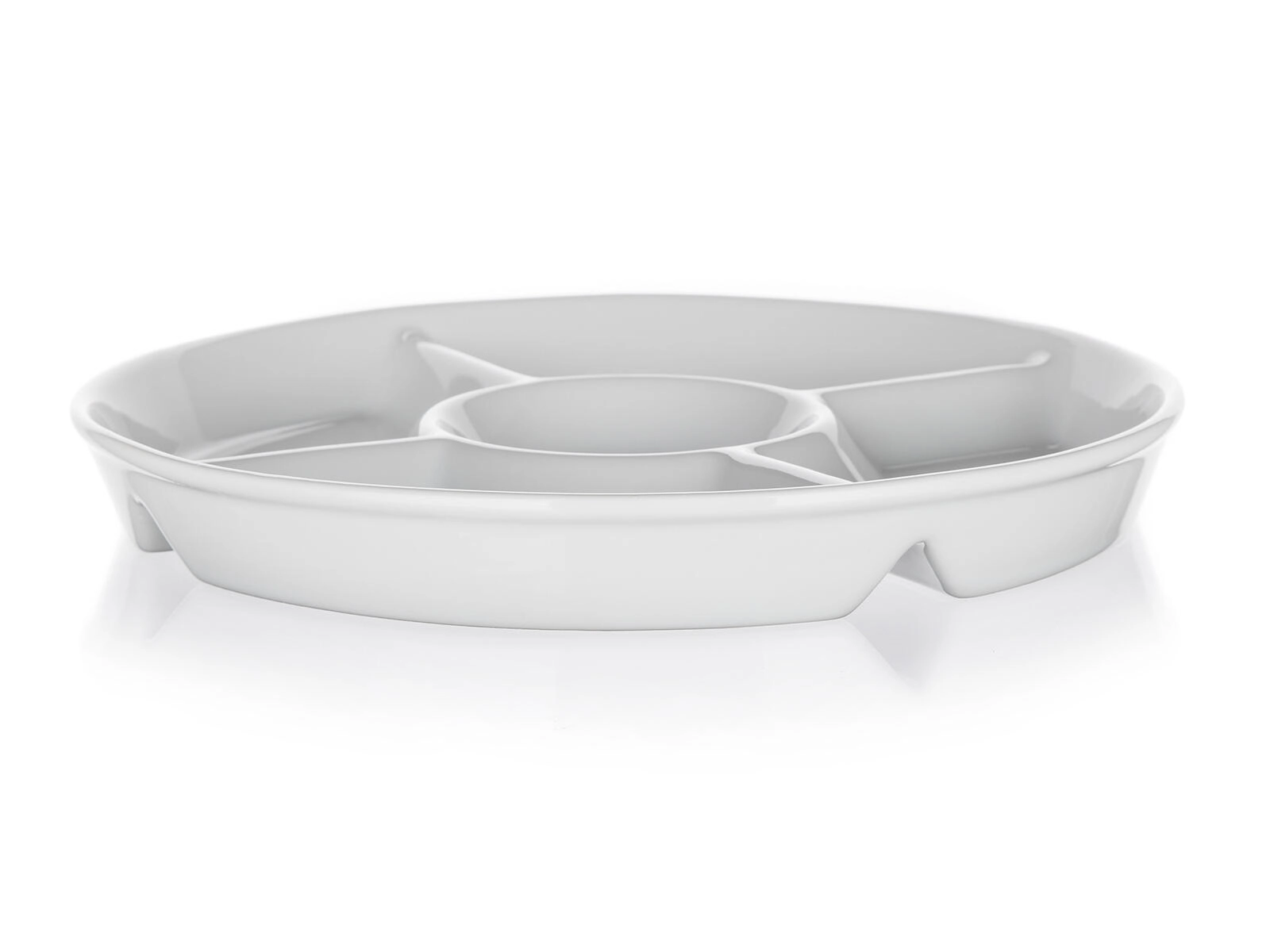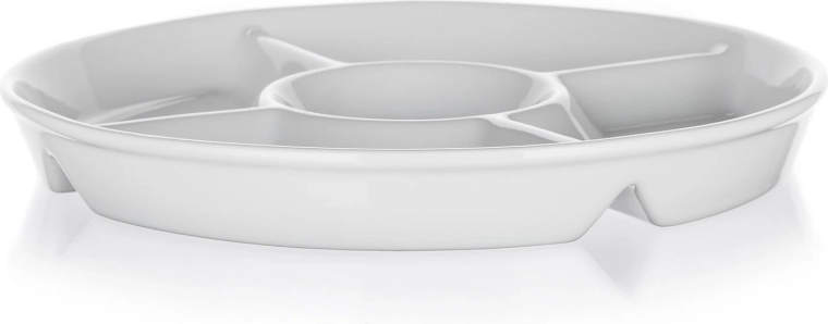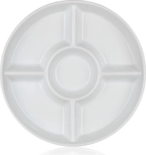 Elegant delt serveringsskål af kvalitetsporcelæn BIANCA med en diameter på 30 cm i en universel hvid farve. Den praktiske opdeling i sektioner holder smagene adskilt – ideel til dip, nødder, chips, frugt og grøntsager. Let at vedligeholde, tåler opvaskemaskine og er perfekt til hverdagsbrug såvel som til gæstebud.
