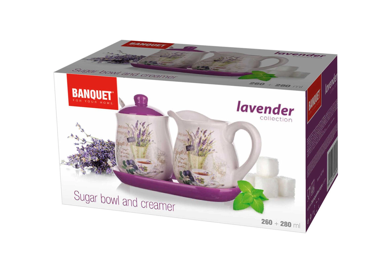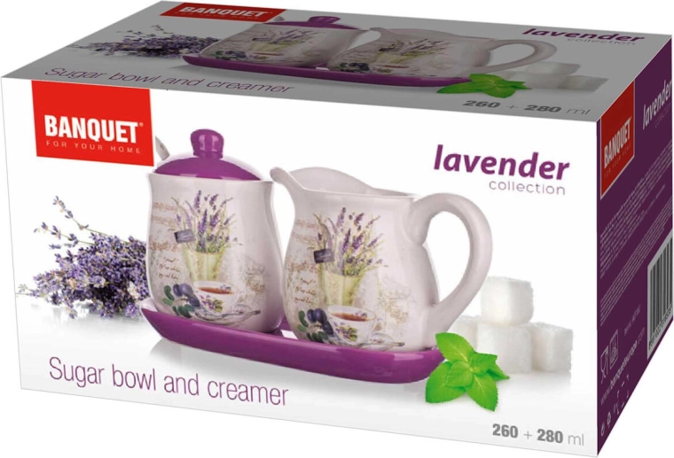 Elegant keramiksæt til køkkenet med motiv af lavendel til stilfuld servering af kaffe og te. Indeholder mælkekande 260 ml, sukkerskål 280 ml, teske og bakke. Kvalitetskeramik sikrer holdbarhed og nem vedligeholdelse; egnet til opvaskemaskine (for at bevare udseendet på lang sigt anbefales håndvask).