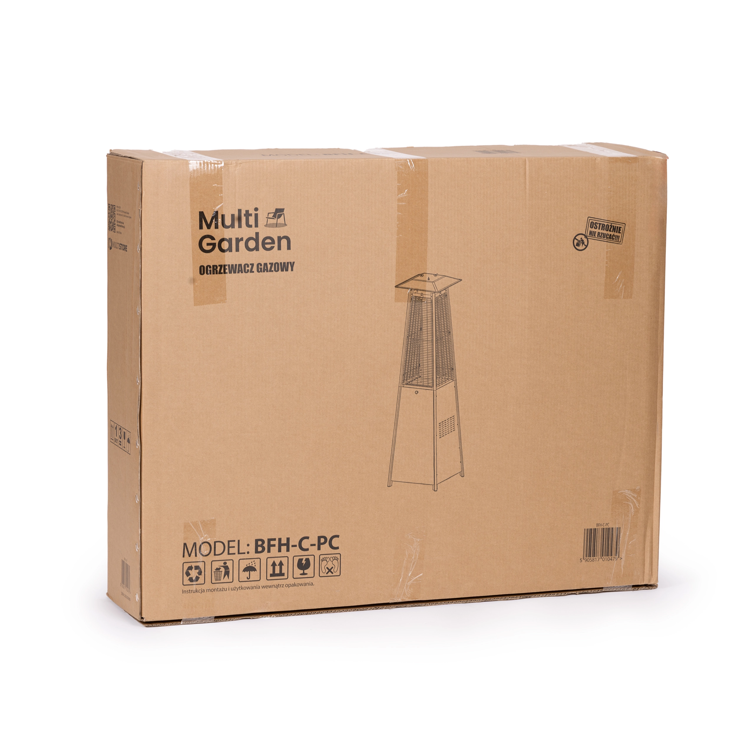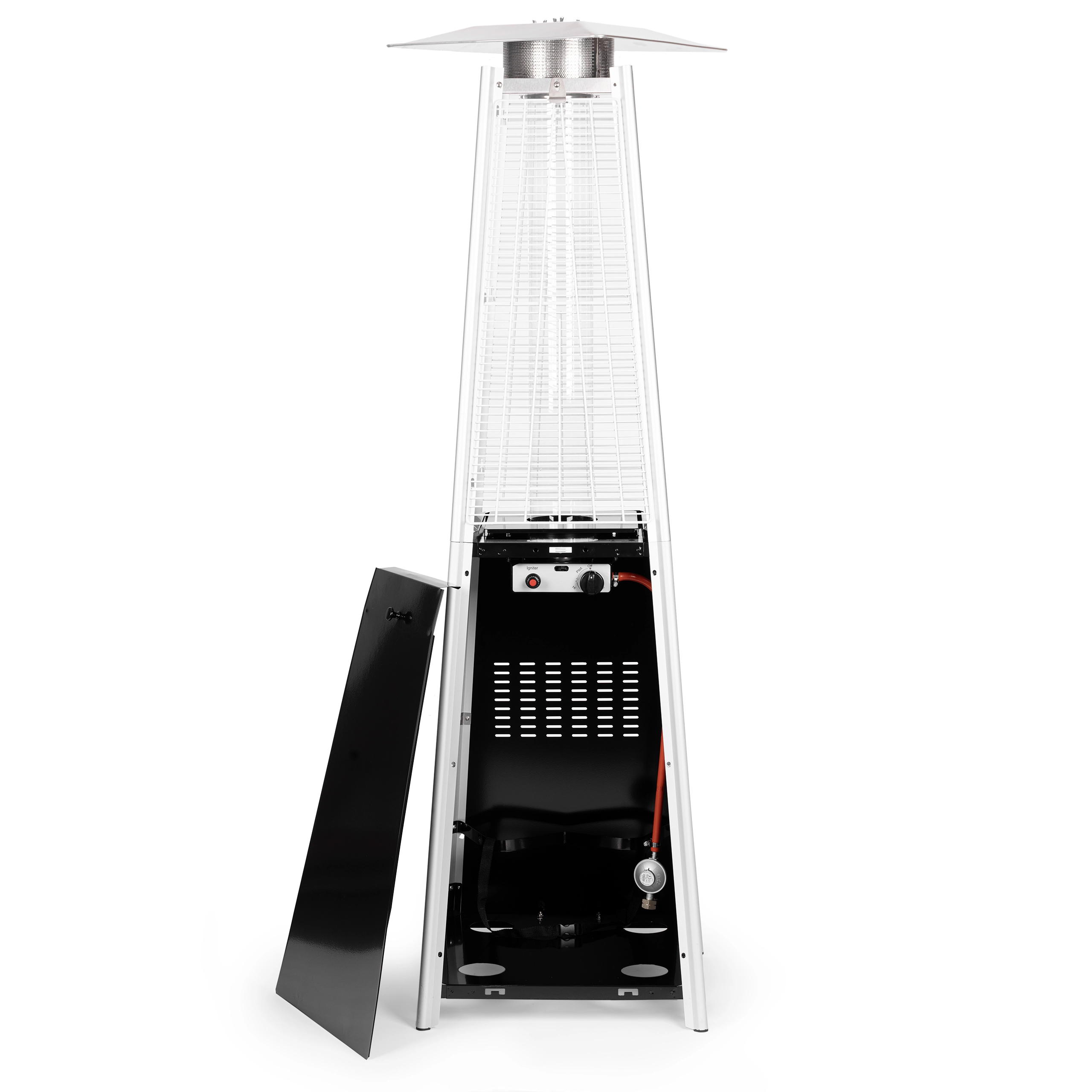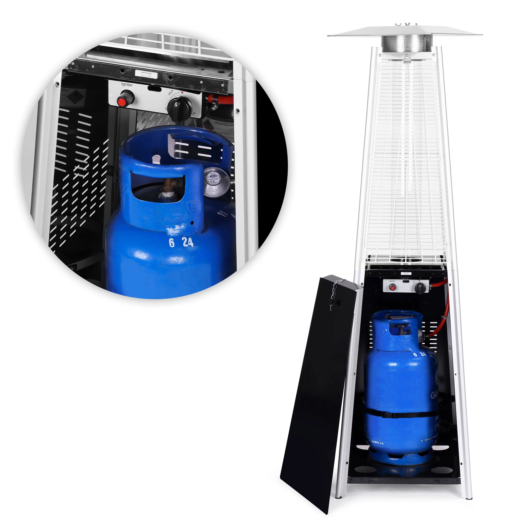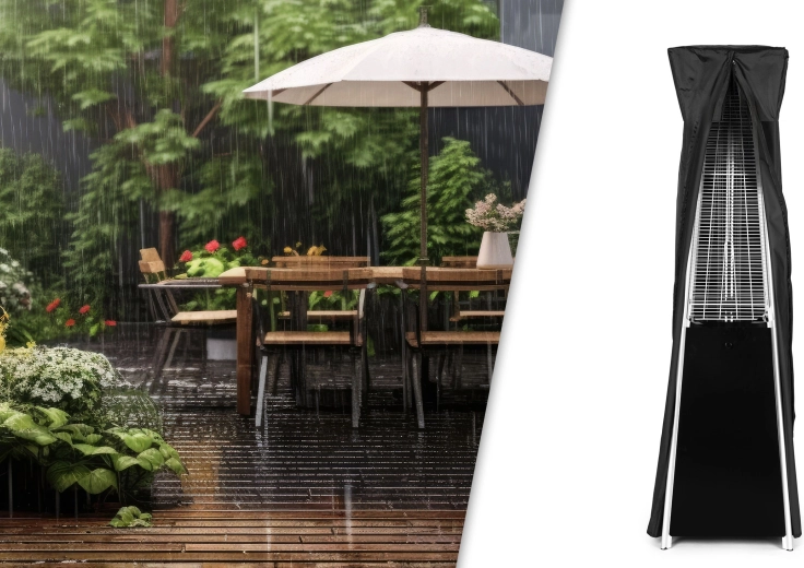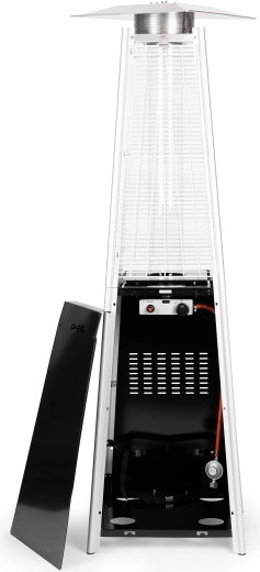 For maksimal sikkerhed har varmeren et låsbart rum til LPG-flaske (op til 11 kg) med sikringsrem. I pakken medfølger trykreduceringsventil med slange samt et vandafvisende overtræk til beskyttelse mod regn og støv. En ideel løsning til udendørs brug året rundt.