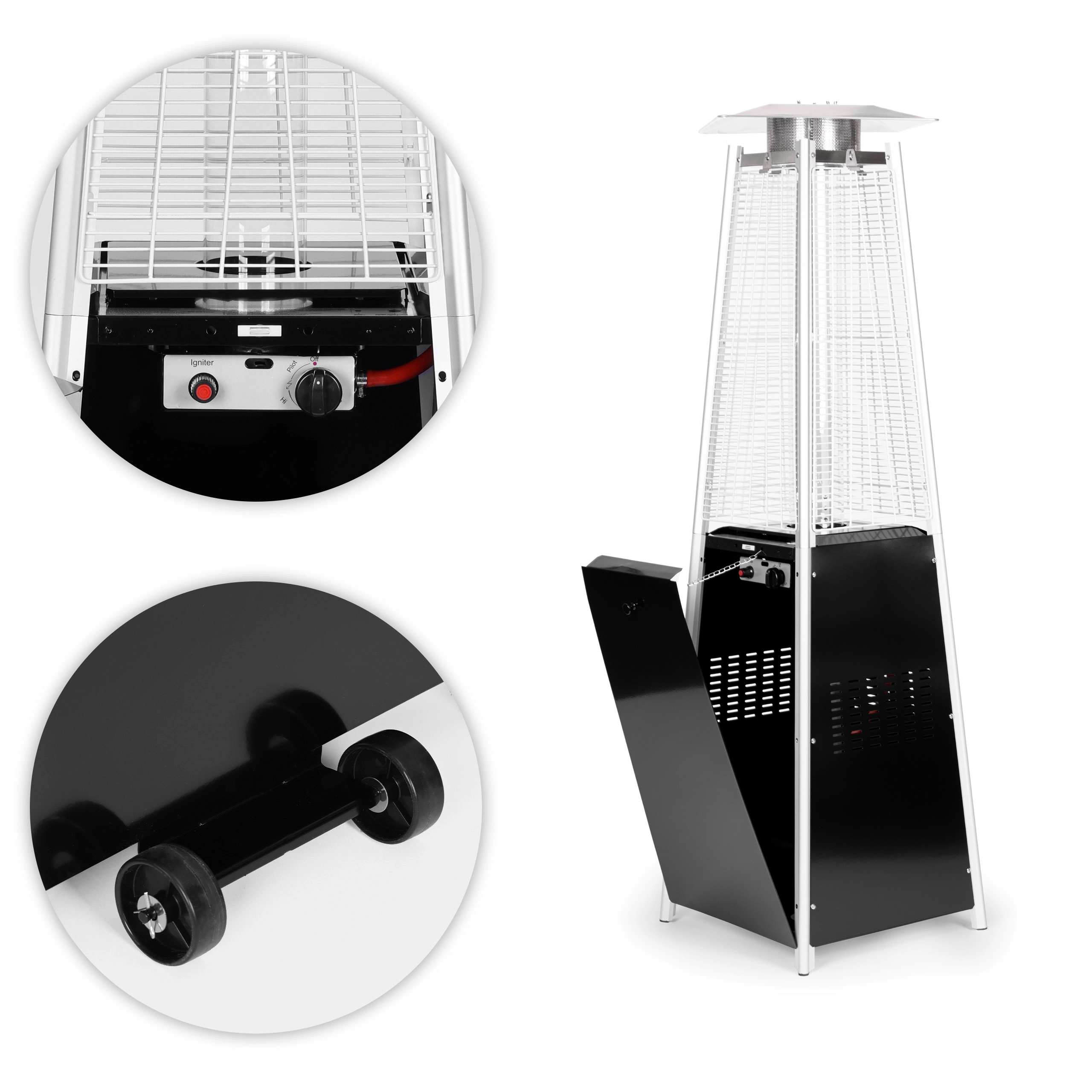 Betjeningspanelet giver trinløs effektregulering efter vejrforholdene. Elektrisk tænding (1× AAA, medfølger ikke) gør opstarten let, og energieffektiv drift sparer gas. Integrerede transporthjul og gummifødder gør håndtering nem og skåner underlaget.