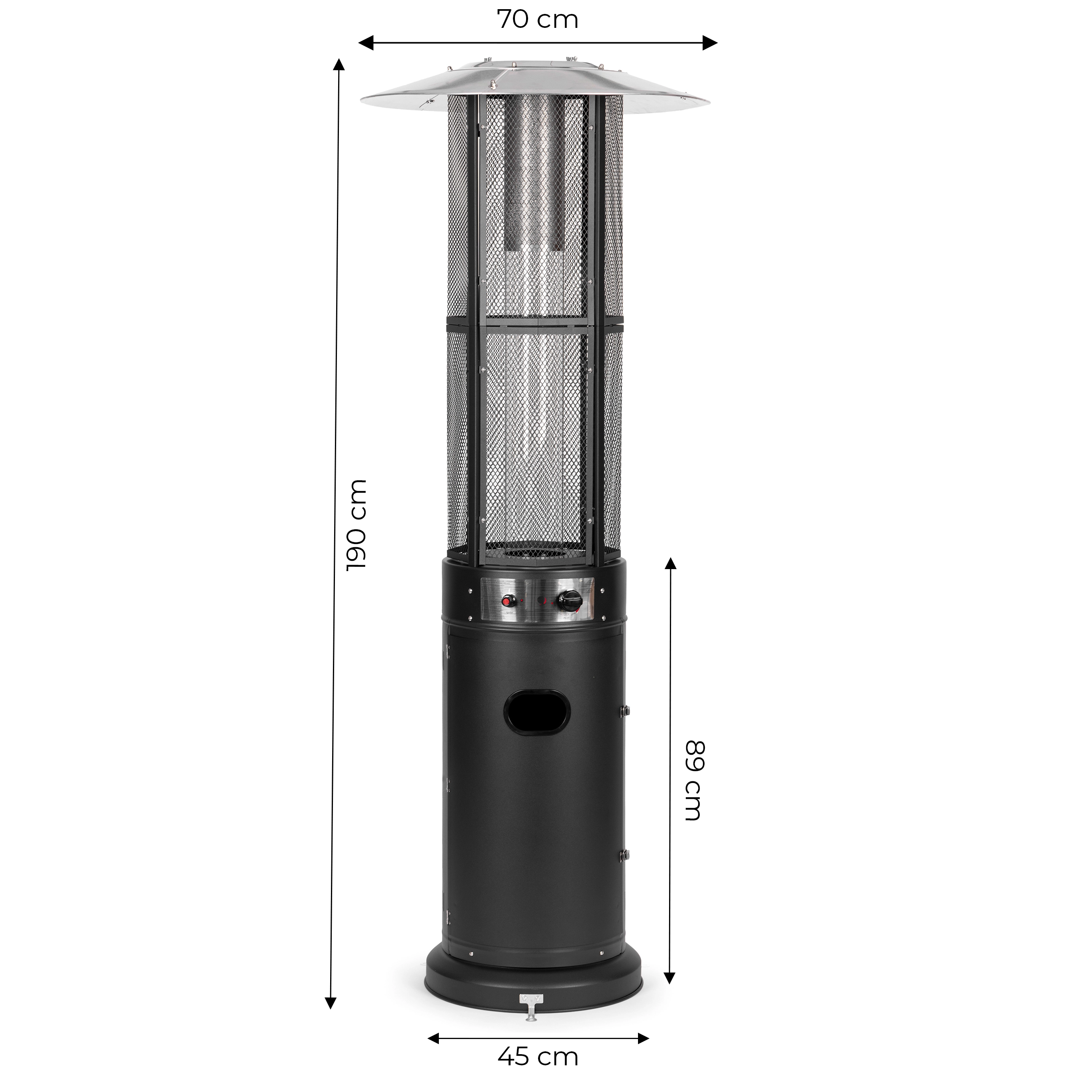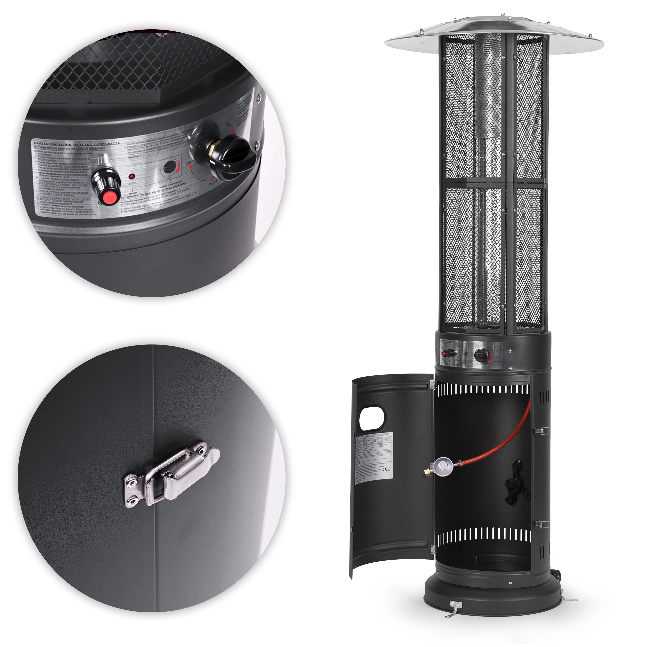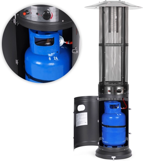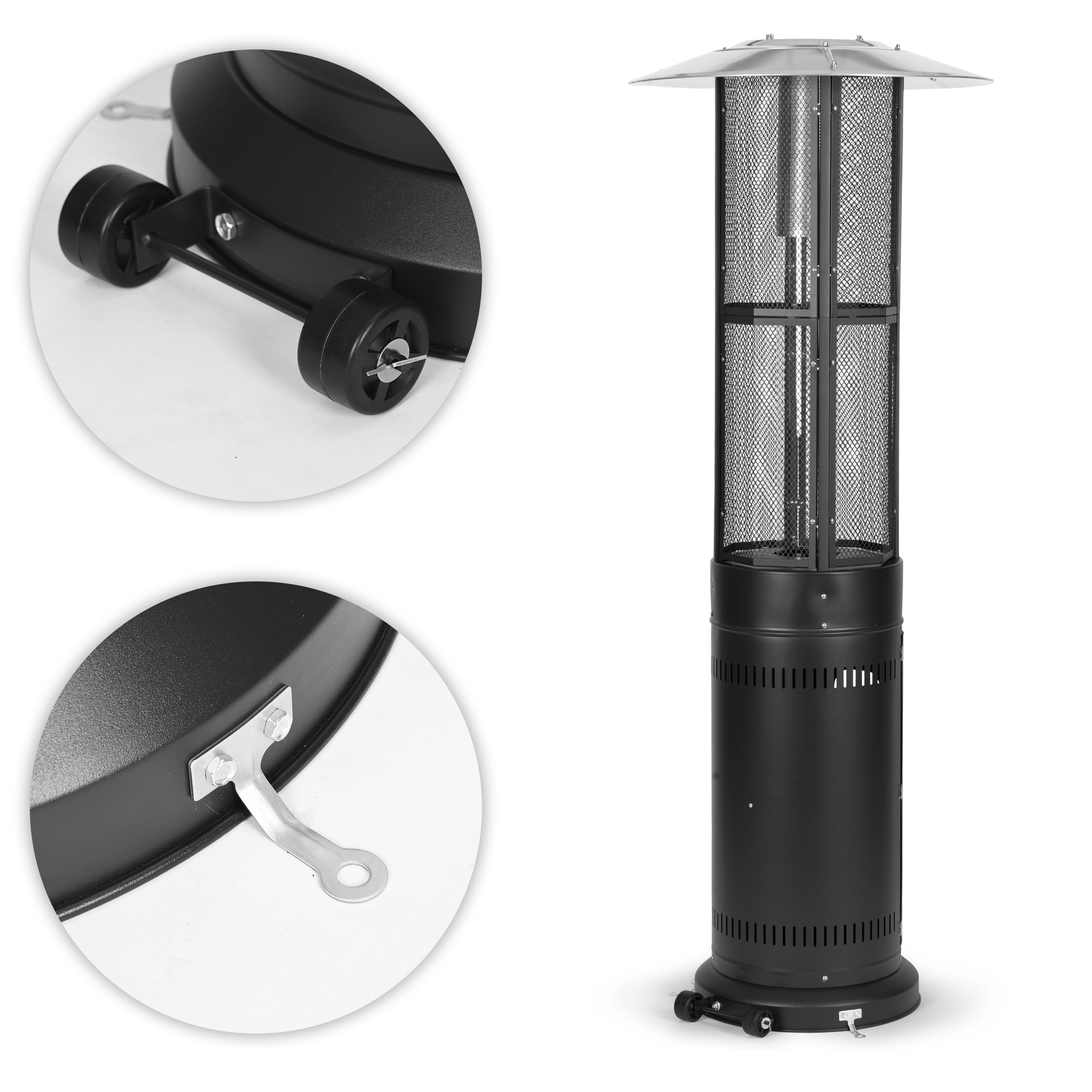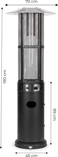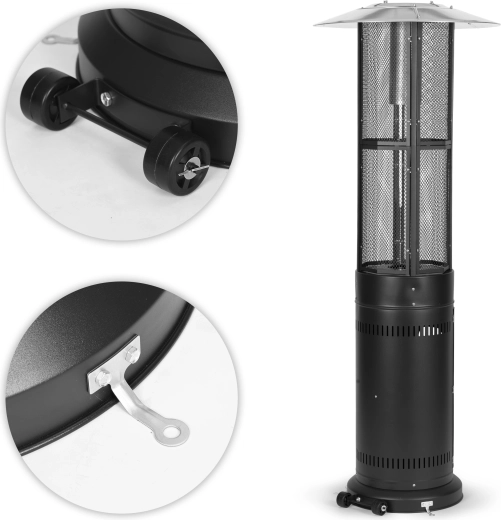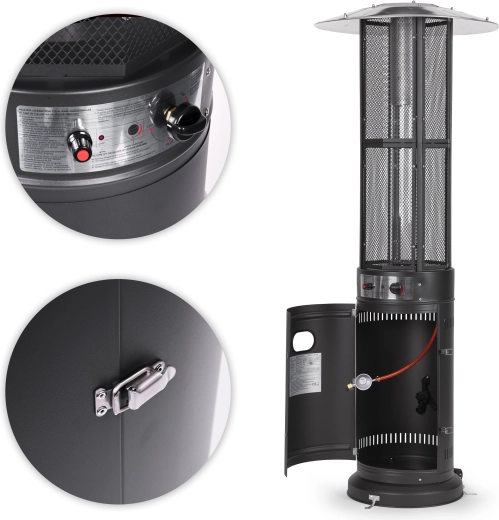 Betjeningen er intuitiv: trinløs flammeregulering og elektrisk tænding (1× AAA, ikke inkluderet) muliggør hurtig start og præcis indstilling af intensiteten. Det lukkelige rum til gasflaske (op til 11 kg) med magnetiske låger og fastgørelsesrem øger sikkerhed og æstetik. Hjul gør det nemt at flytte enheden, og til faste installationer findes forankringsbeslag i basen.