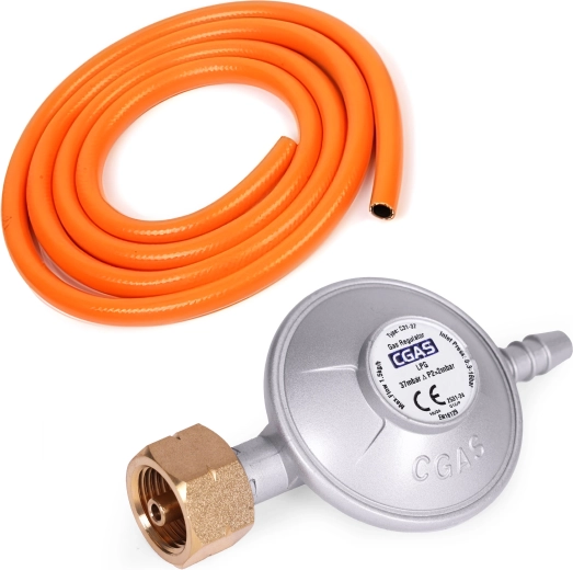 Klar til brug med det samme – i pakken finder du en pålidelig trykregulator, en fleksibel orange slange med klemmer samt et robust vandafvisende overtræk til beskyttelse under opbevaring og i dårligt vejr.