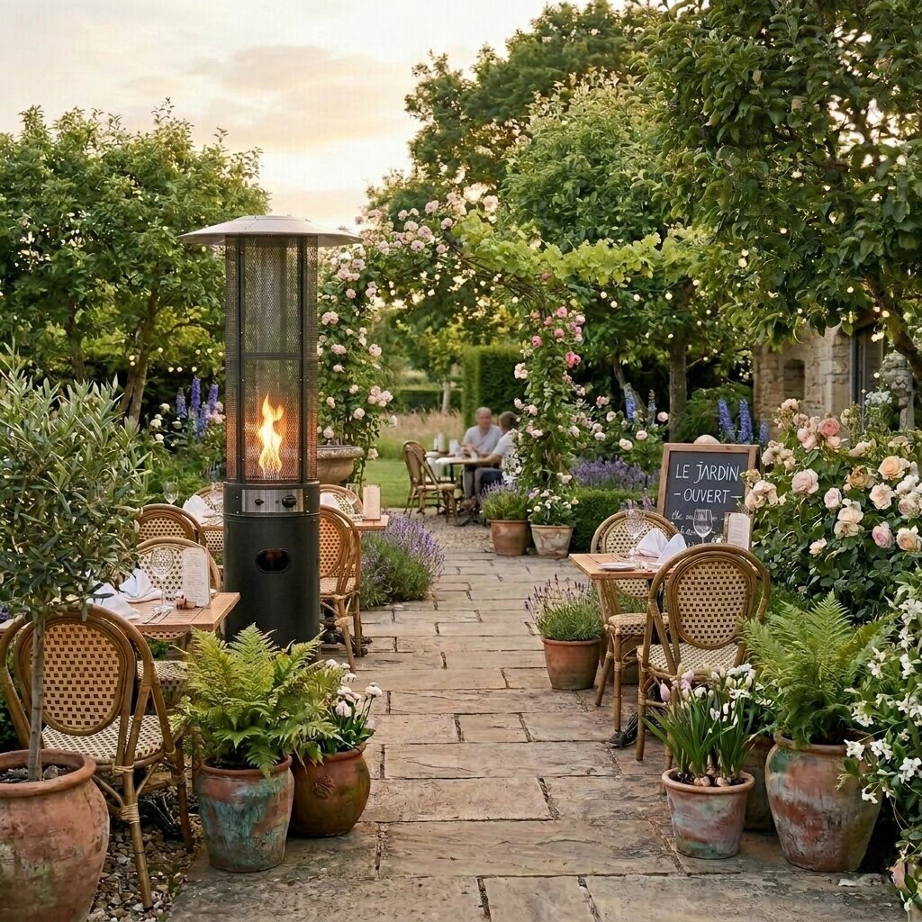 I pakken finder du alt til hurtig ibrugtagning: trykregulator, orange gasslange med klemmer samt vandafvisende beskyttelsesovertræk til opbevaring og vejrbeskyttelse. Ideel til terrasser, pergolaer, haver, restauranter og events.