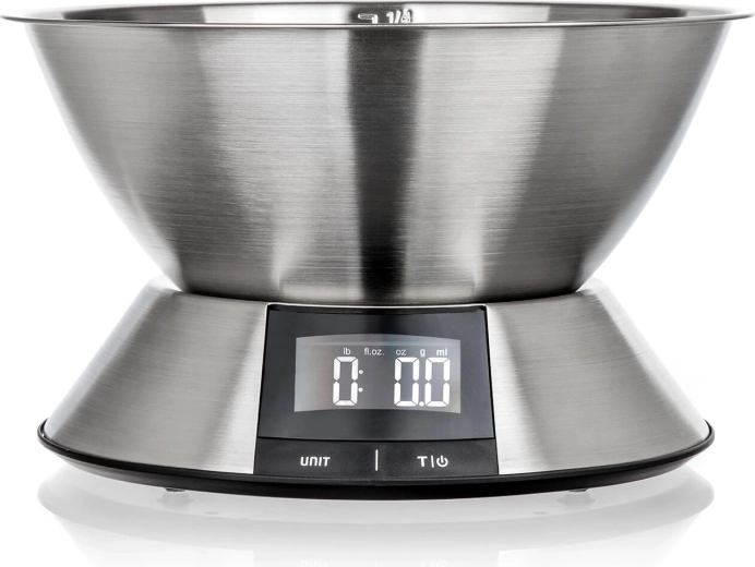 Med tare-funktionen nulstiller du nemt beholderens vægt og kan efterveje ingredienser trin for trin. Automatisk slukning sparer på batteriet, mens indikator for lavt batteriniveau og overbelastning sikrer problemfri brug. Skålen i rustfrit stål med volumen-skala gør både opmåling og rengøring lettere.