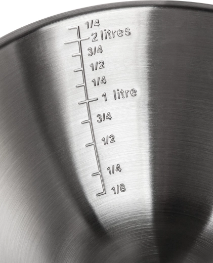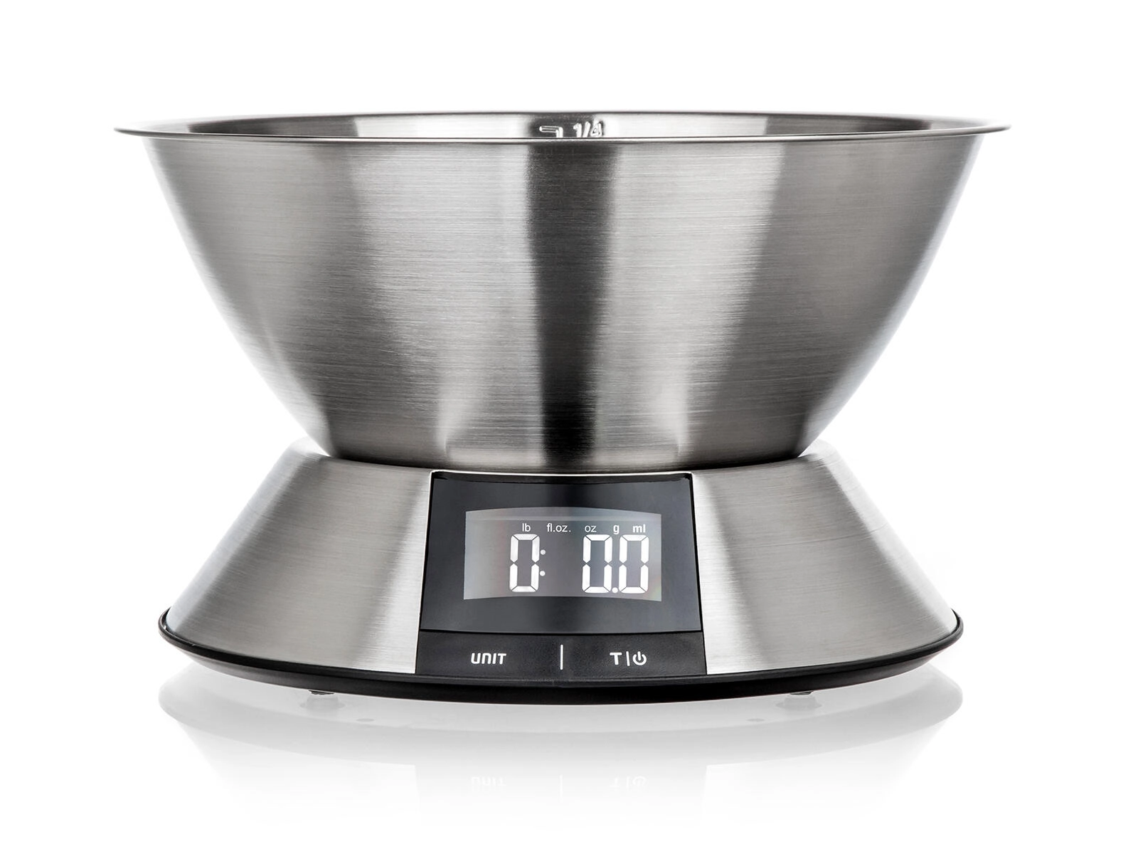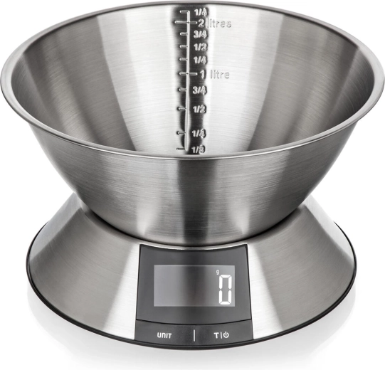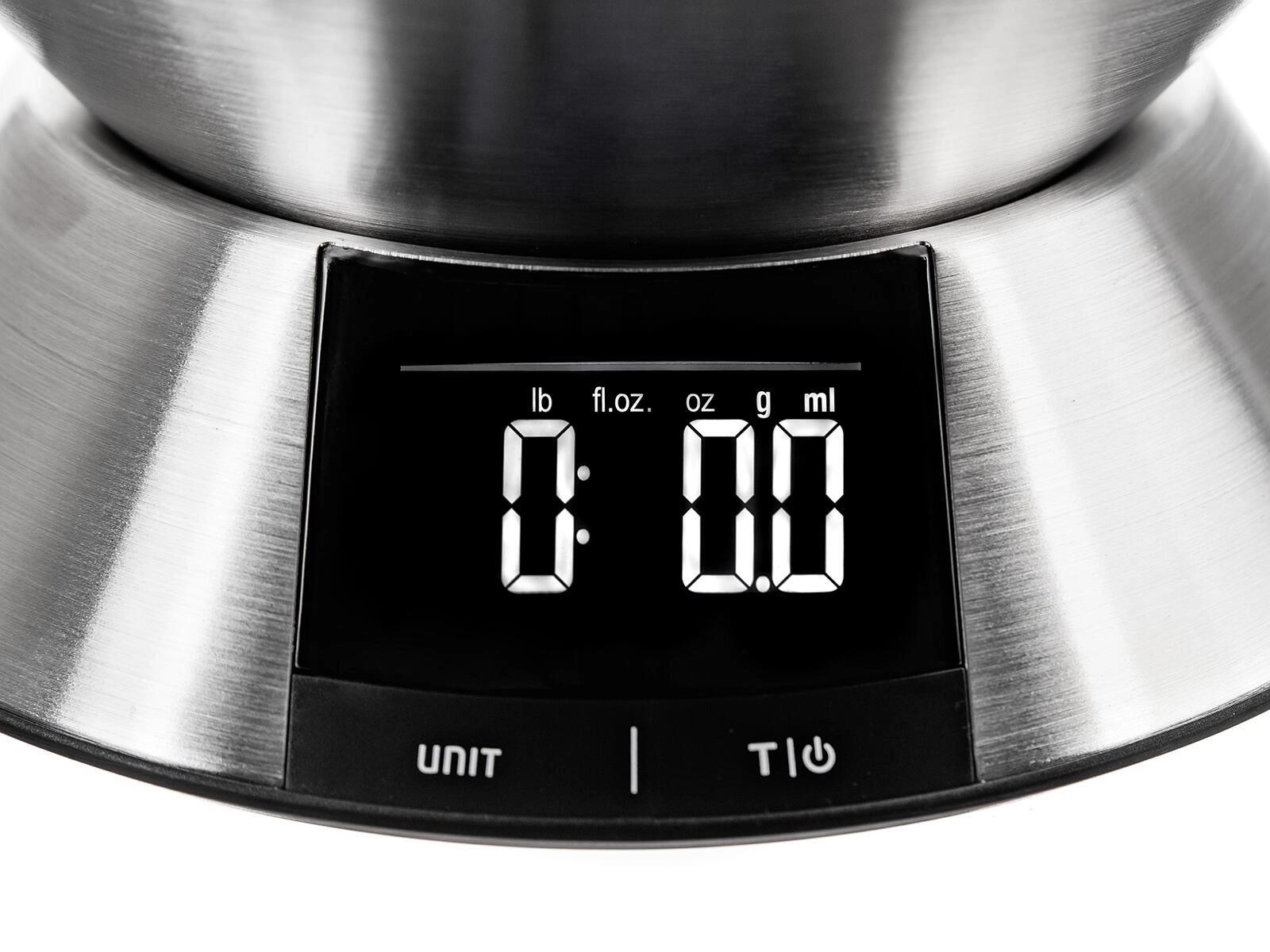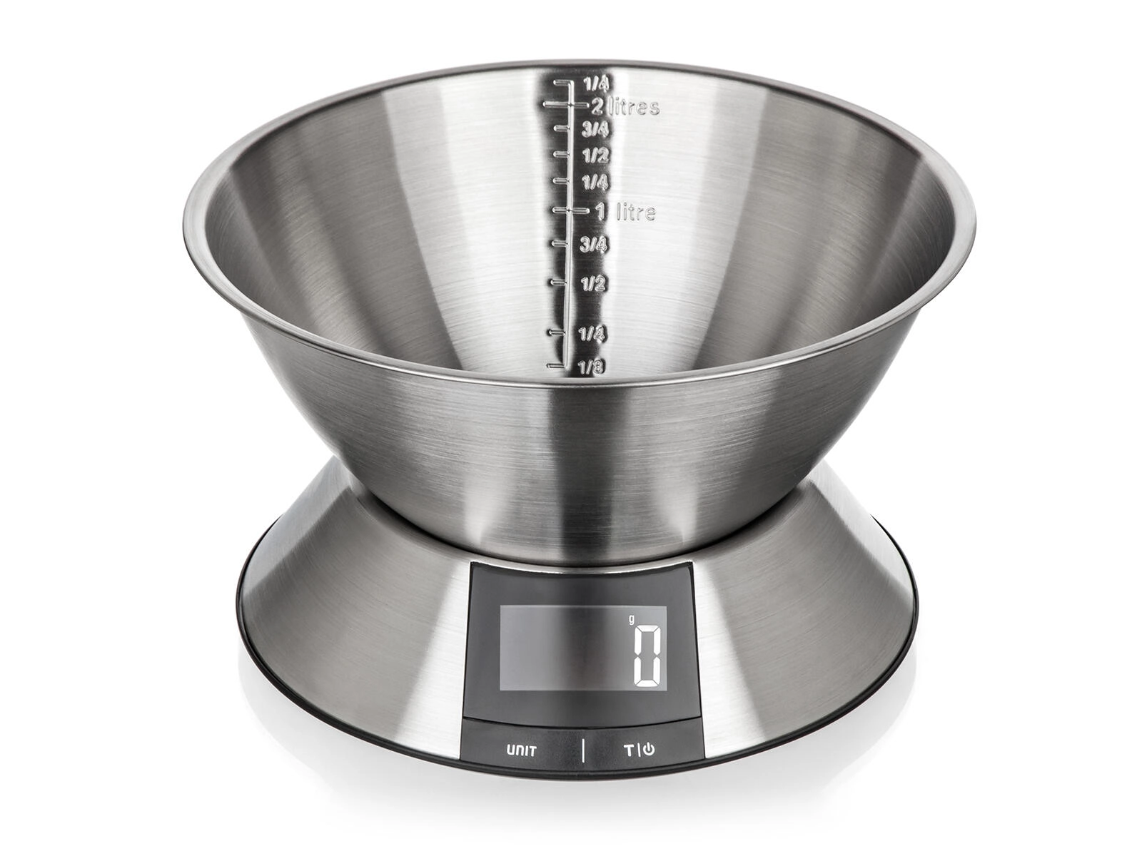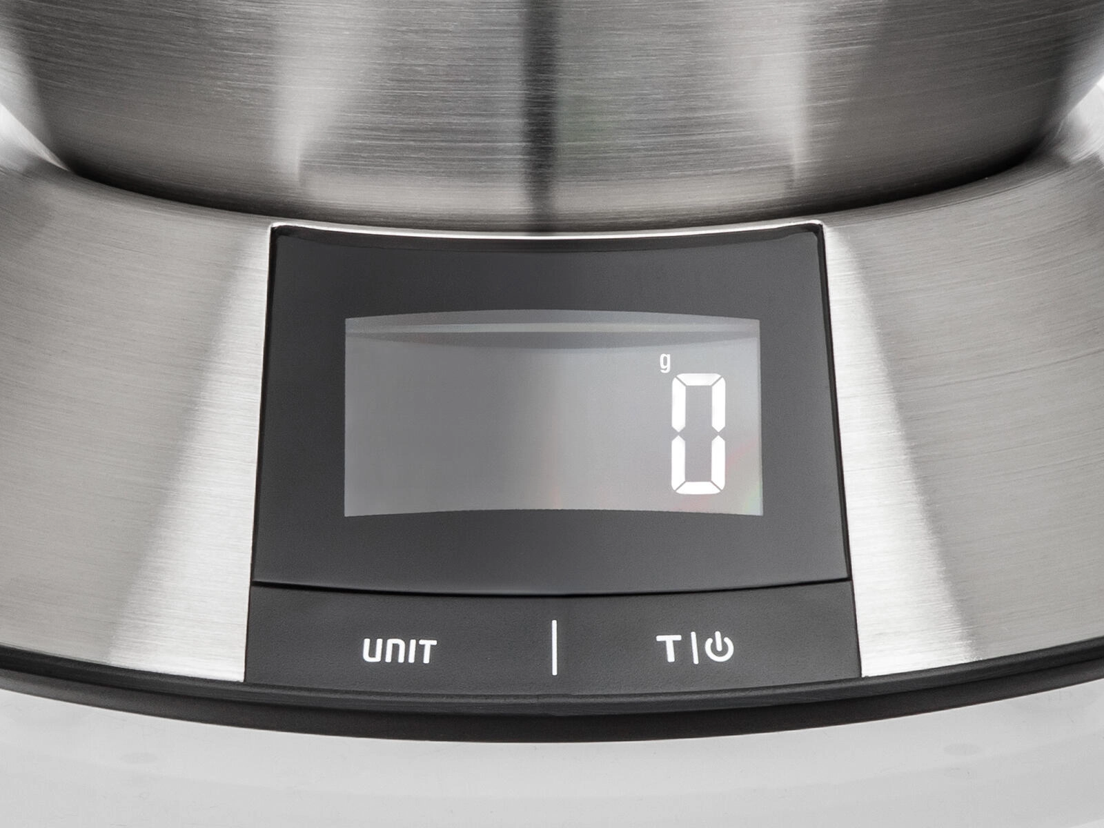 Den integrerede skål i rustfrit stål med præget mærkning op til 2 liter gør det muligt at måle væsker og tørre ingredienser præcist direkte under vejningen.