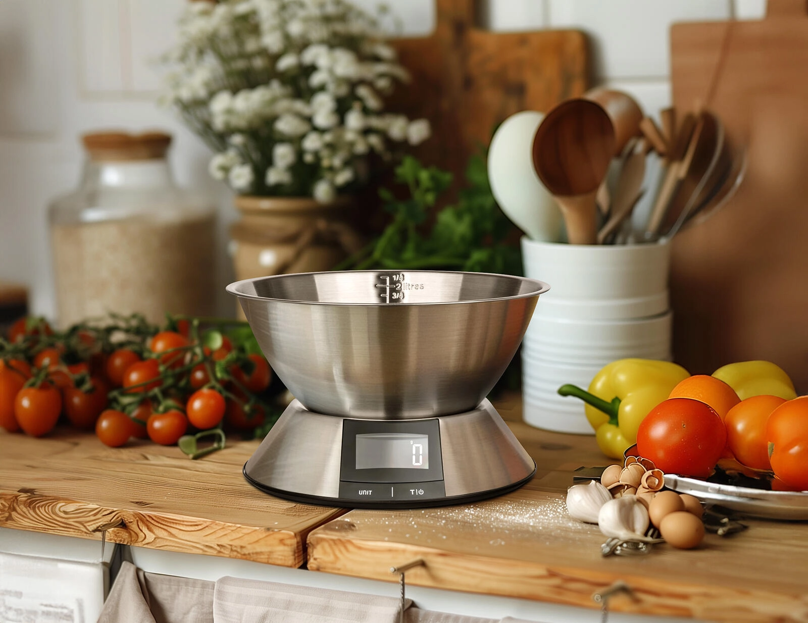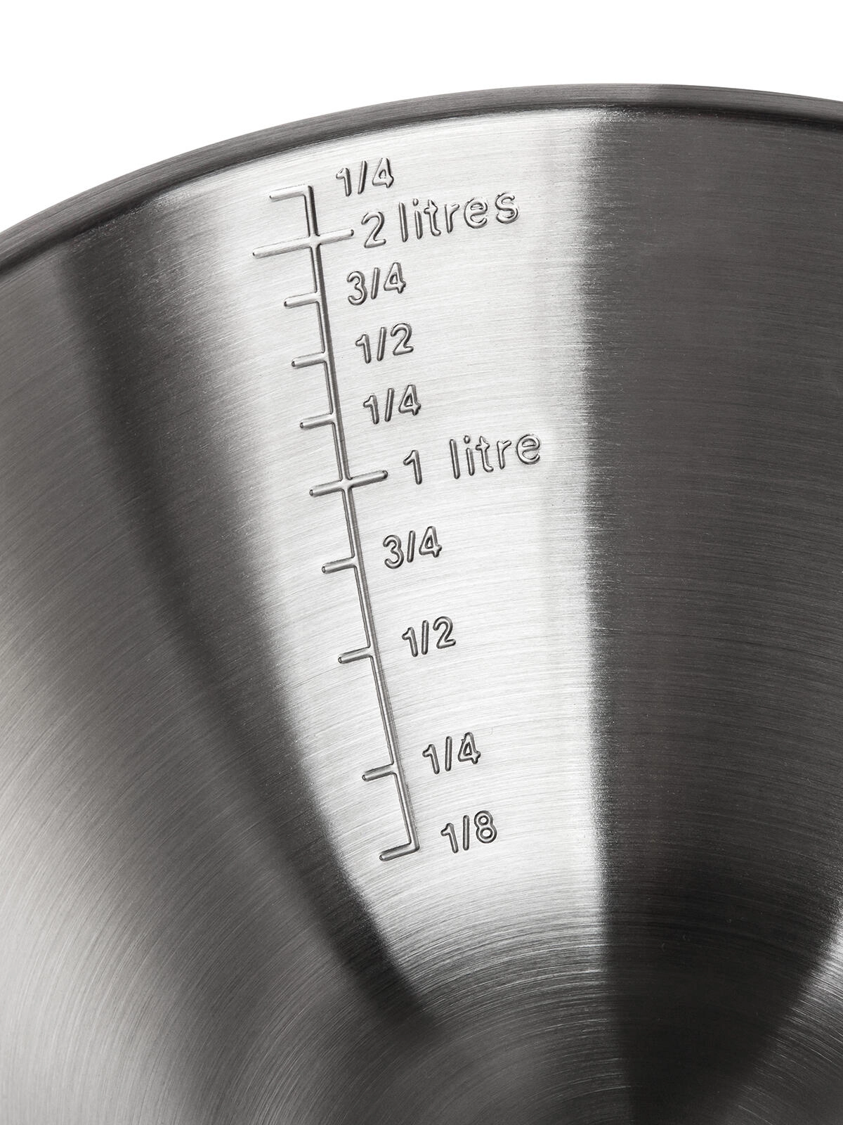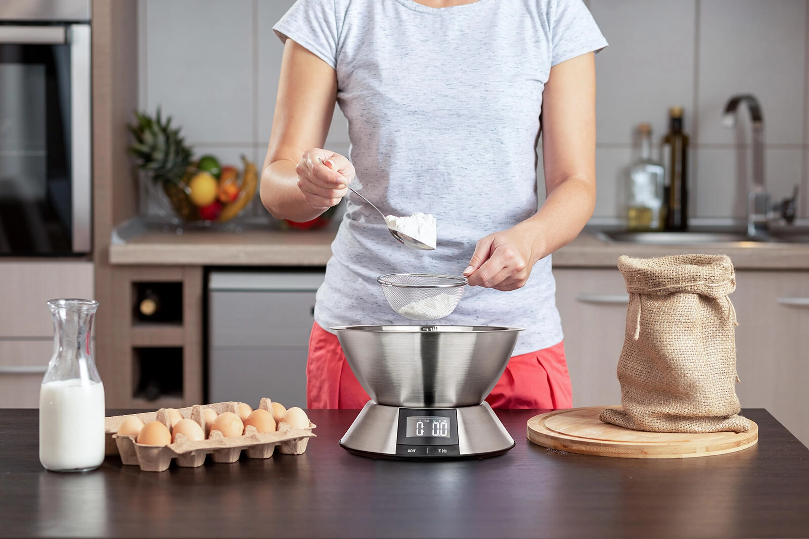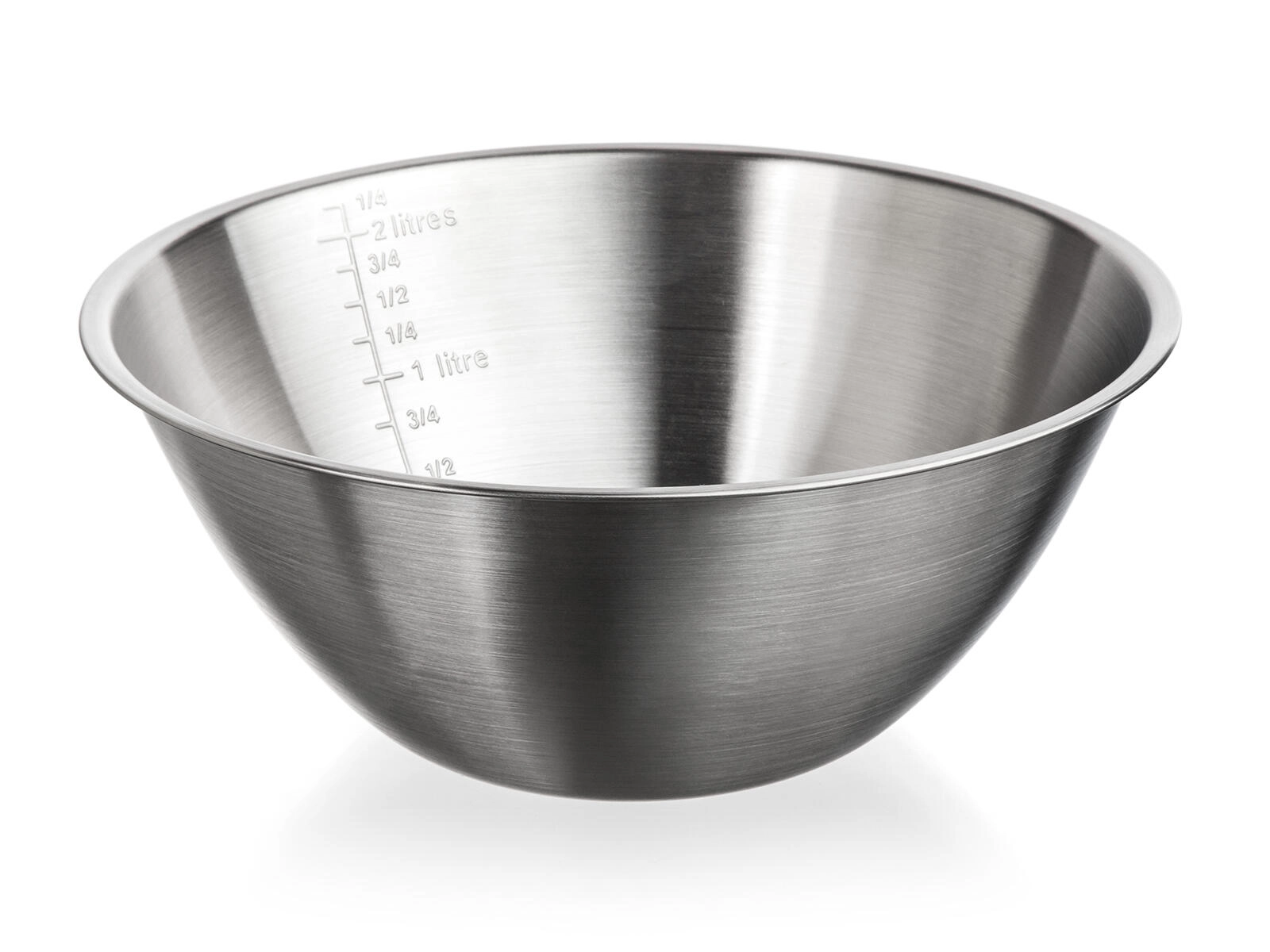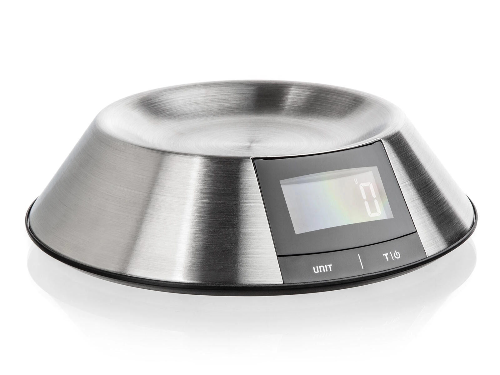 Den integrerede skål i rustfrit stål med præget mærkning op til 2 liter gør det muligt at måle væsker og tørre ingredienser præcist direkte under vejningen.