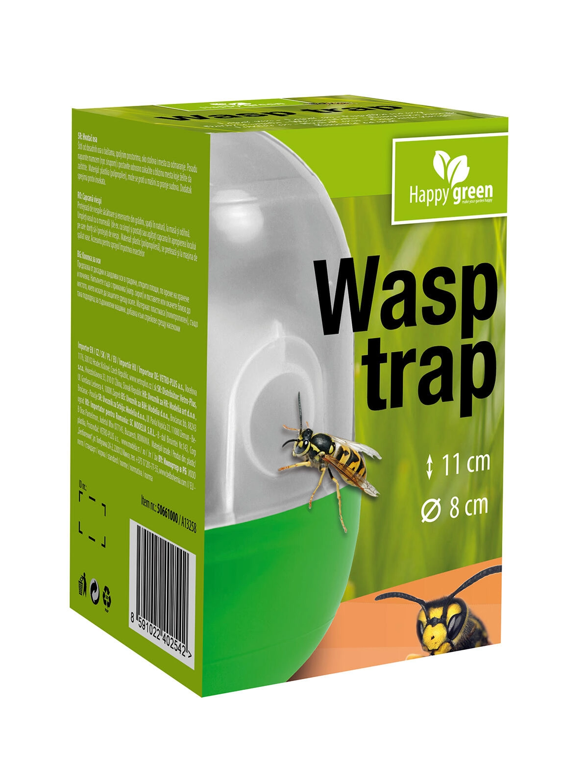 Hvepsefangeren er en diskret hjælper til hyggelige stunder i haven, på altanen eller terrassen. Kombinationen af vand og sød lokkemad får hvepsene nemt til at flyve ind, hvor de bliver fanget. Det gennemsigtige design gør det let at kontrollere fyldningsniveauet, mens de grønne dele passer ind i udemiljøet.