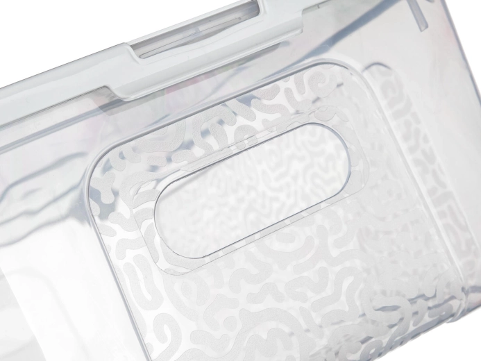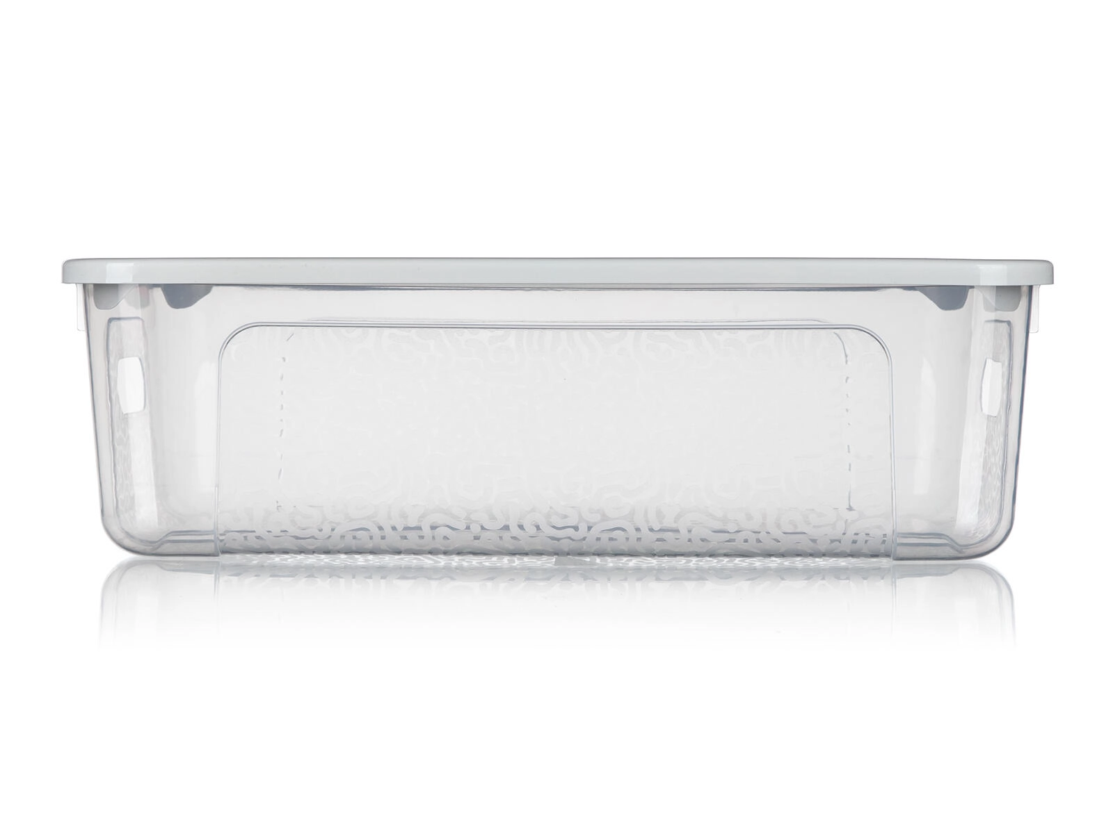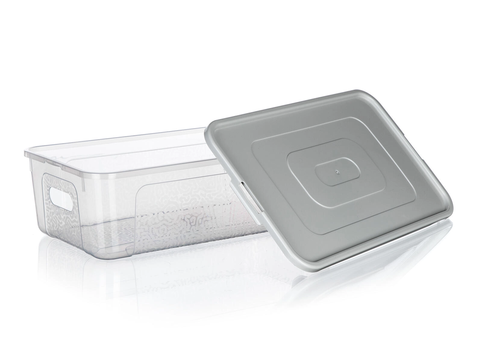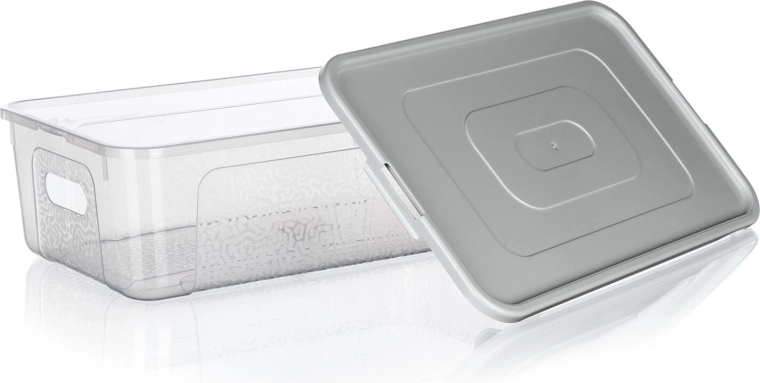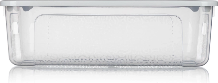 Boksen er fremstillet af robust plast, har integrerede sidehåndtag for nem håndtering, og takket være den lave, rektangulære form passer den i hylder og under sengen. Låget bliver sikkert på plads, så de opbevarede ting forbliver beskyttet mod støv og spild.