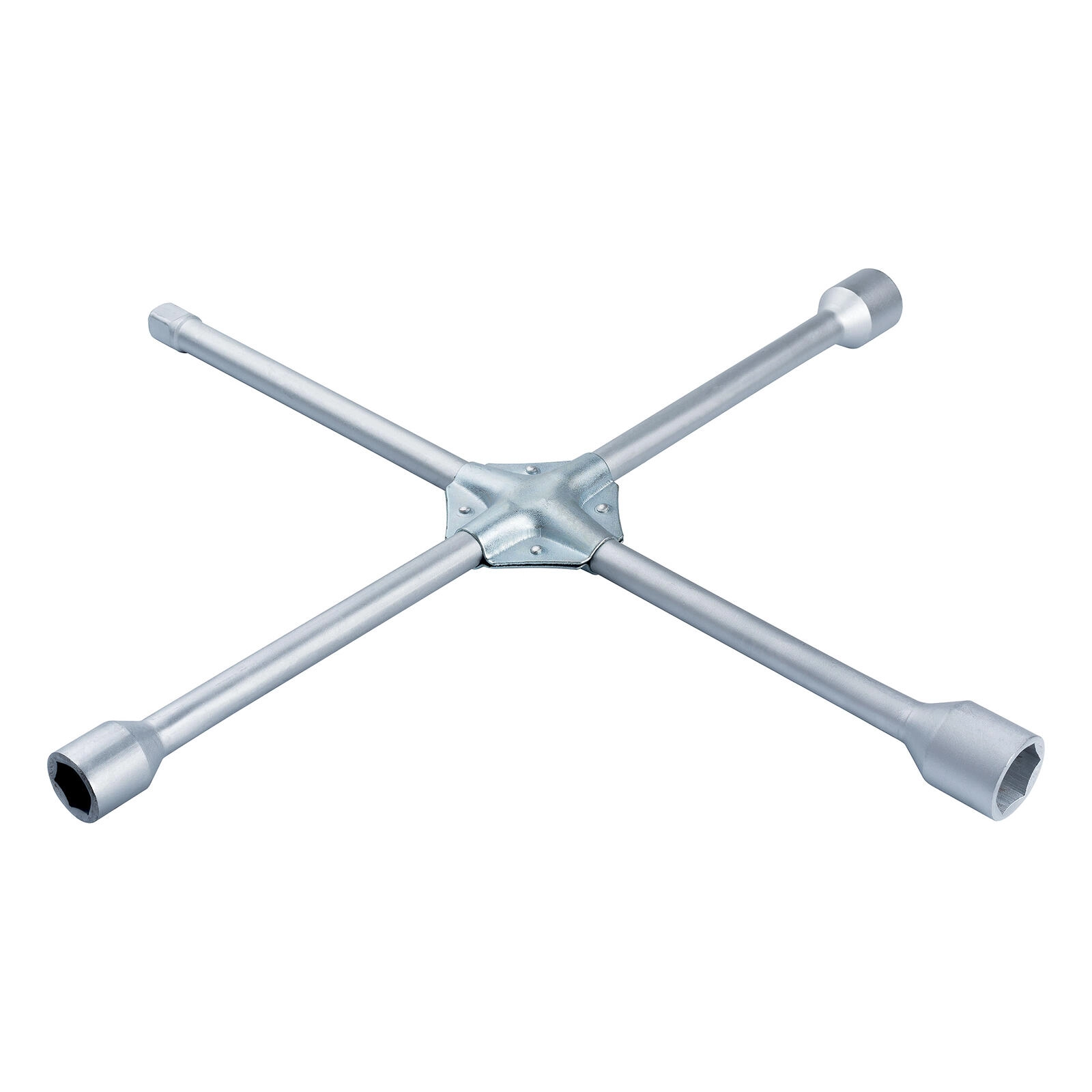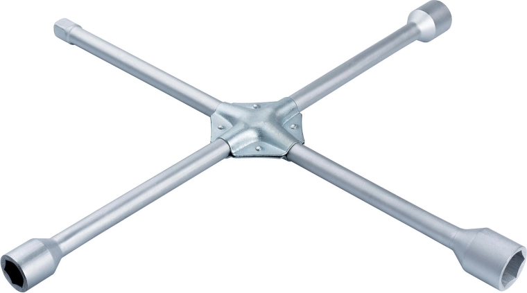 Robust krydset hjulnøgle med fire topstørrelser 17/19/21/23 mm til hurtig hjulskift og service. Fremstillet af højkvalitets stål med skridsikker overflade for et sikkert og behageligt greb. Muliggør effektiv tilspænding af bolte med tilstrækkelig kraft og dækker de mest almindelige størrelser på hjulmøtrikker.