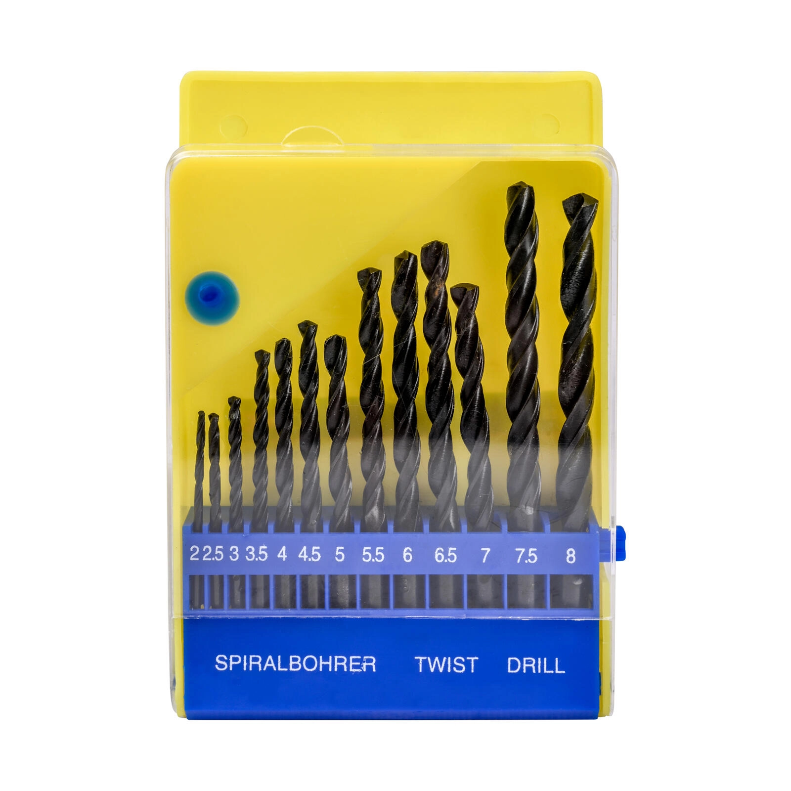 Tretten præcist aftrappede diametre fra 1,5 til 8 mm dækker de fleste almindelige anvendelser. Alt er overskueligt opbevaret og mærket for hurtig udvælgelse.