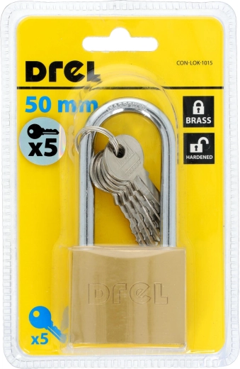 Hængelås 50 mm med forlænget bøjle, messing, 5 nøgler