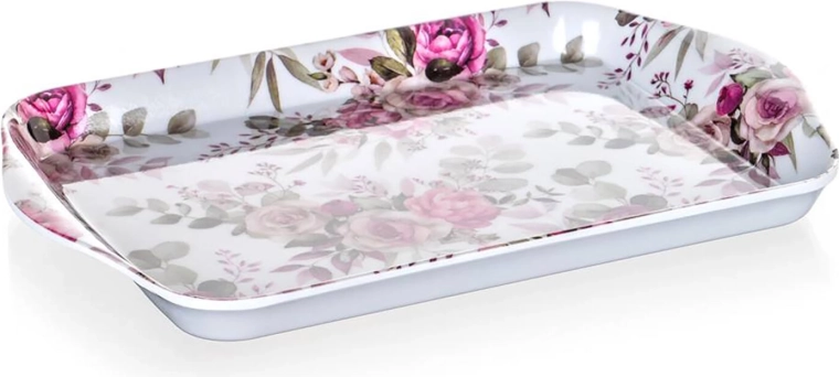 Stilfuld melaminbakke i Rose-dekor, ideel til servering af kaffe, desserter eller morgenmad. Det lette, men robuste materiale sikrer nem håndtering og lang levetid, så den er et glimrende valg til hjemmet, kontoret og på farten.