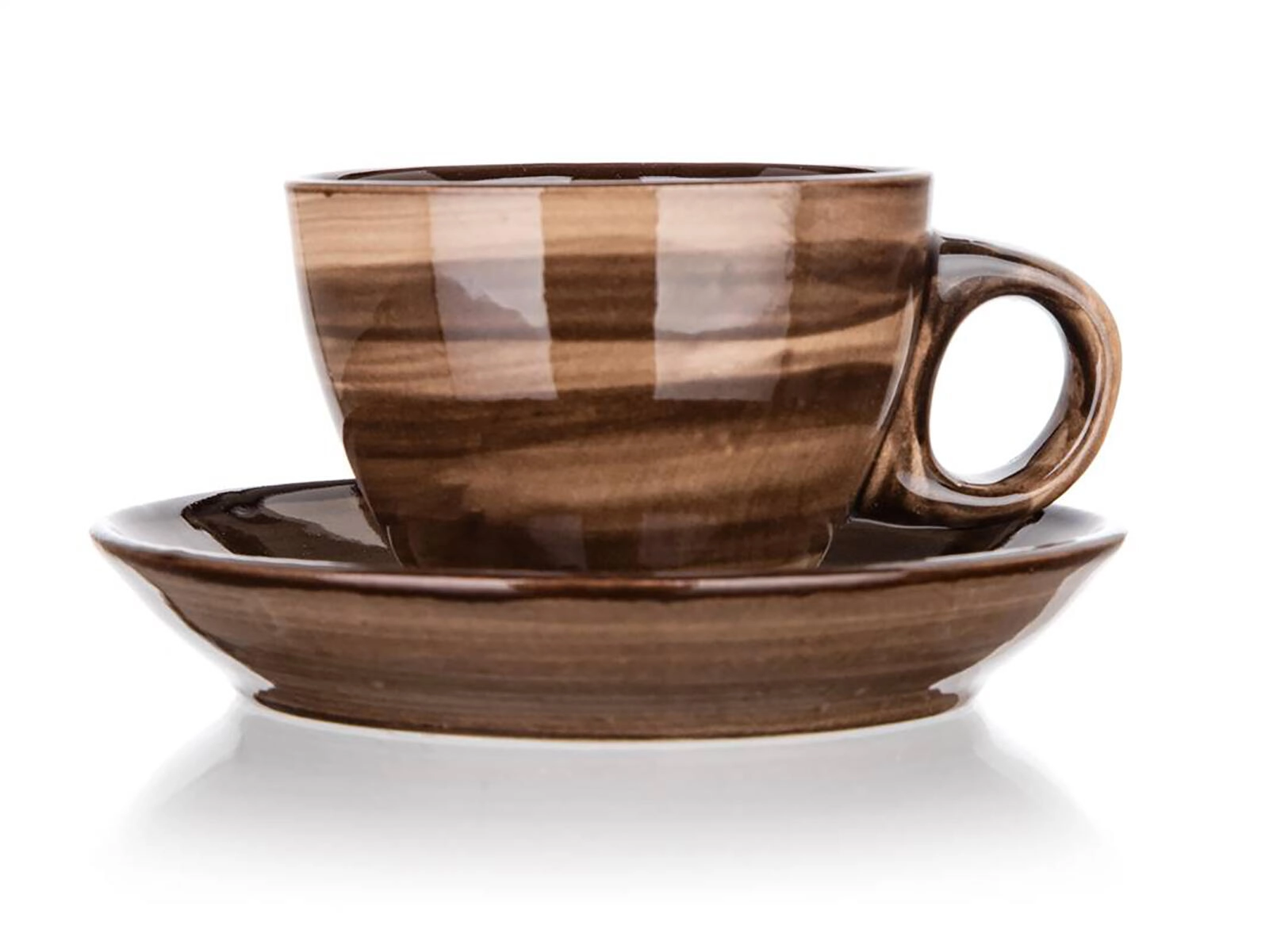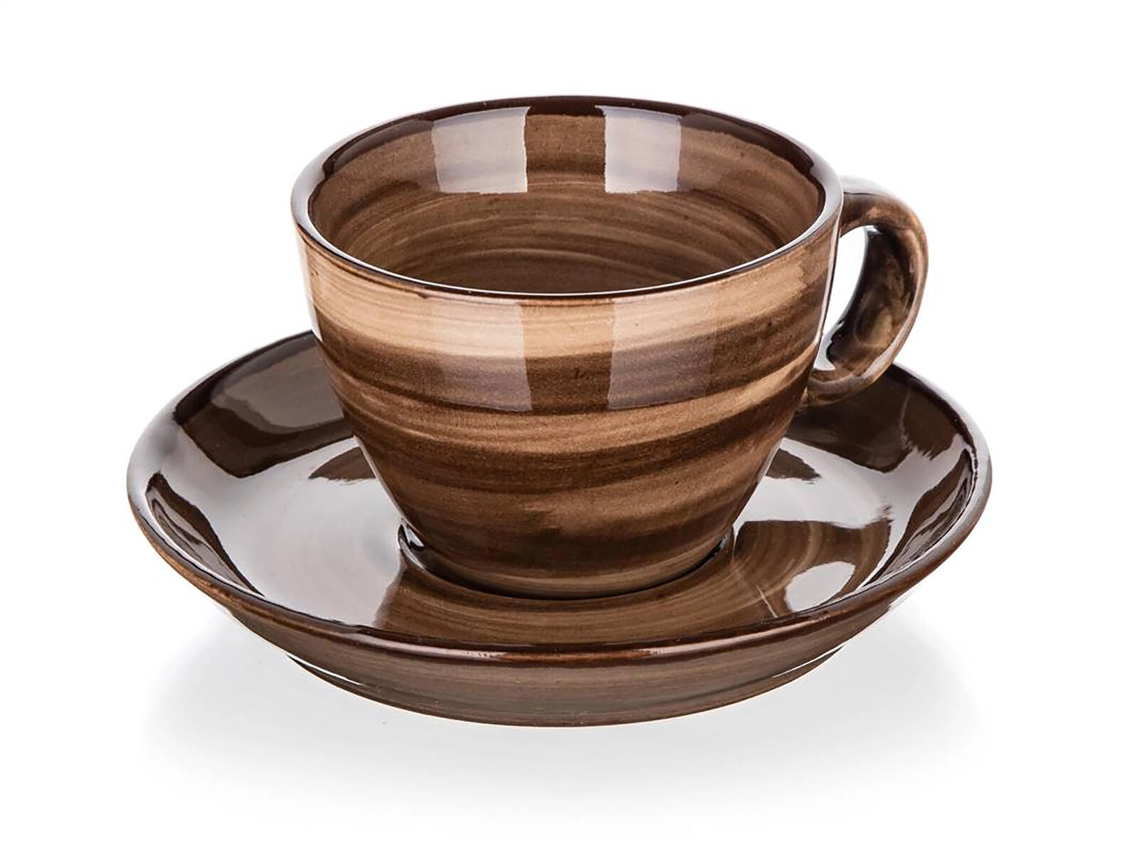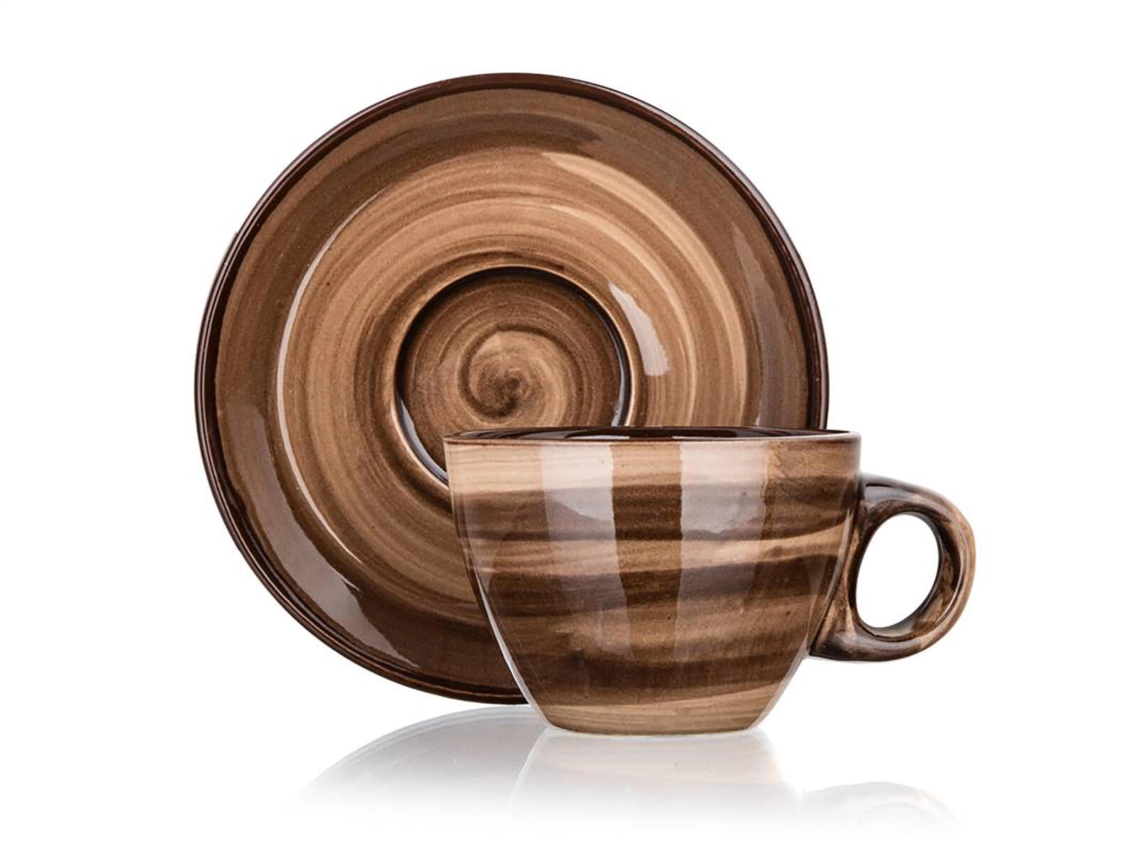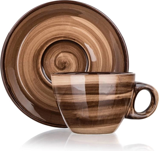 Elegant brun marmorering og blank glasur giver borddækningen et premium look, mens underkoppen sørger for stabilitet og opfanger dryp.