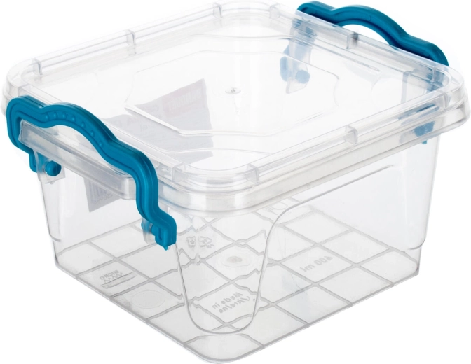 Praktisk køkkendåse med volumen 0,4 l i firkantet form og transparent krop, suppleret med turkise håndtag for nem transport. Velegnet til fryser ned til −25 °C og mikrobølgeovn op til +95 °C, ideel til opbevaring af madvarer og rester.