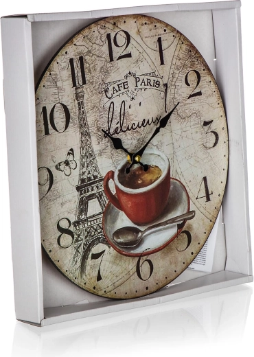 Elegant vægur CAFE PARIS med en diameter på 34 cm giver dit interiør stil som en fransk café. Det byder på en overskuelig urskive, fuldfladedekor og nem strømforsyning med AA-batteri (medfølger ikke). Perfekt til køkken, stue og caféinteriører.