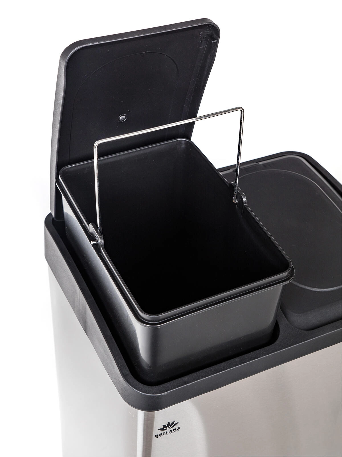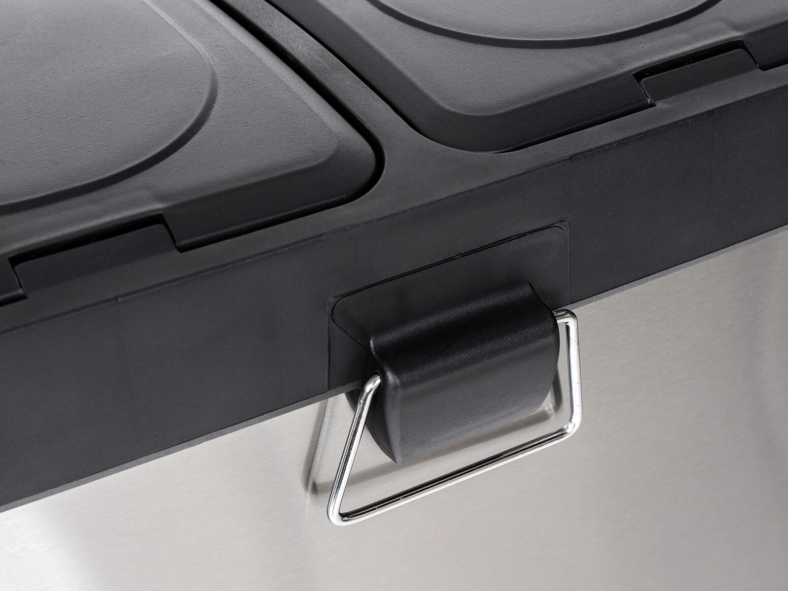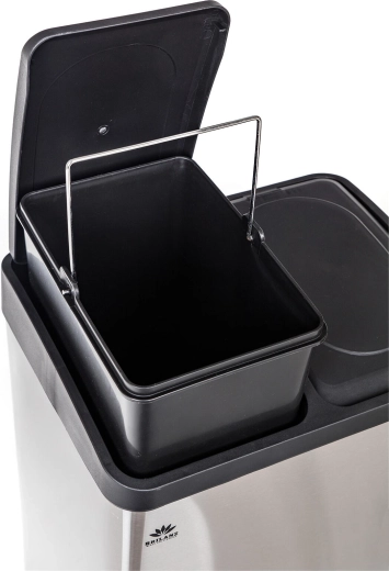 Praktisk og hygiejnisk sorteringsspand med volumen 40 l (2×20 l) i rustfrit stål med to pedaler til berøringsfri åbning. To adskilte rum muliggør nem affaldssortering, aftagelige plastikbeholdere gør rengøring og skift af poser let, og tætsluttende låg hjælper med at begrænse lugt og krydskontaminering.