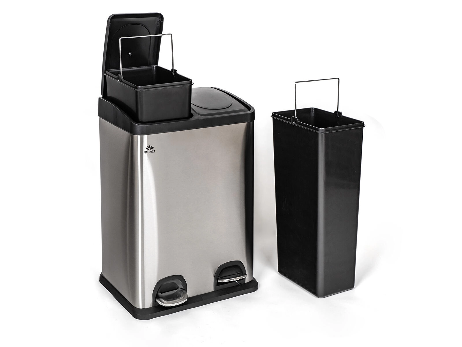 Denne rustfrie skraldespand med dobbelte kamre er ideel til køkkener, kontorer og mindre husholdninger, hvor der lægges vægt på affaldssortering og et rent design. Separate pedaler styrer hvert låg for maksimal hygiejne uden berøring. Aftagelige inderspande i robust plast gør håndtering, rengøring og udskiftning af poser nem.