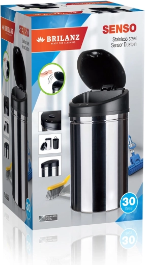 Moderne berøringsfri SENZO-spand med volumen på 30 l i elegant rustfrit stål for renere og mere bekvem rengøring i hjemmet og på kontoret. Takket være den integrerede sensor åbner og lukker låget automatisk, hvilket sikrer maksimal hygiejne uden berøring. Det robuste kabinet i rustfrit stål med blank overflade og en aftagelig indre plastbeholder gør vedligeholdelsen nem. Strømforsyning via 4× AA-batterier med lavt energiforbrug.
