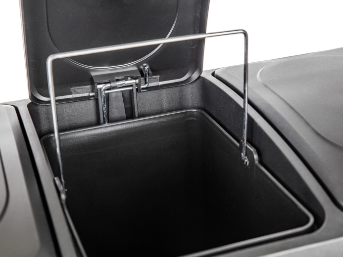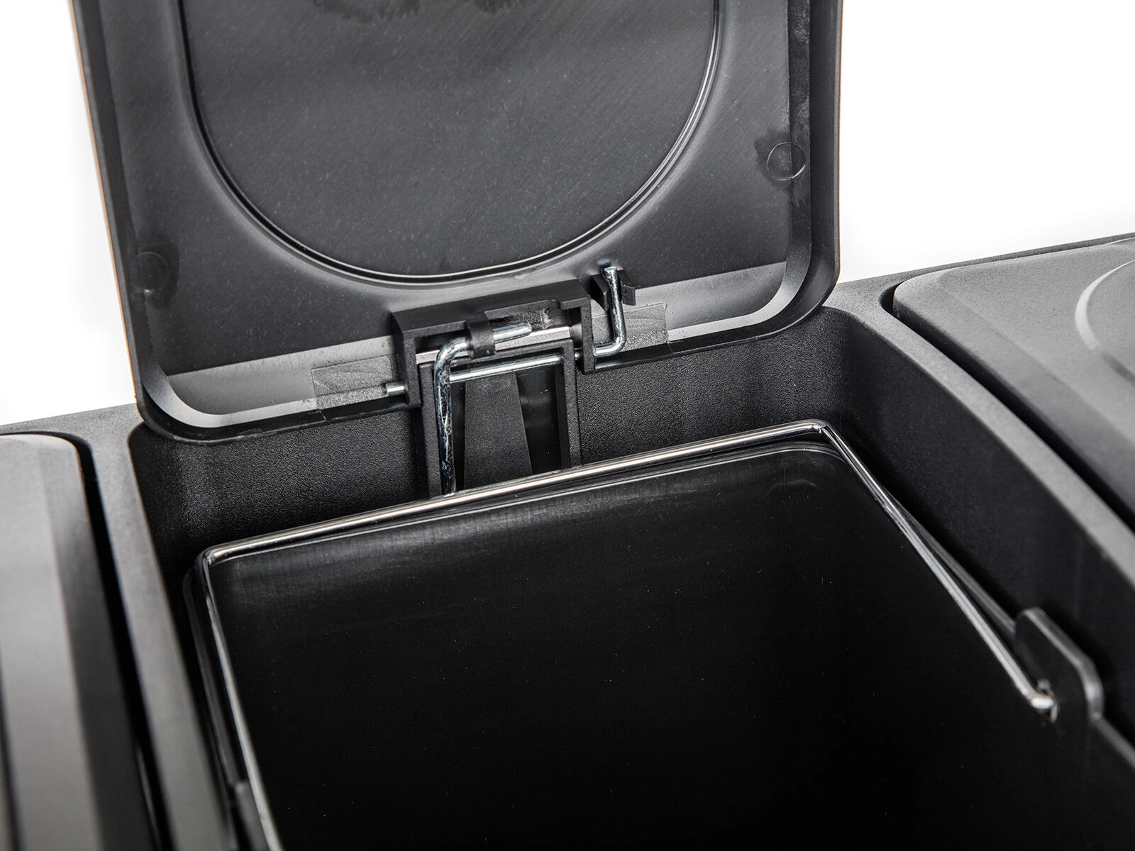 Hvert kammer har sin egen aftagelige beholder med håndtag, hvilket gør udskiftning af poser og rengøring hurtig og uden rod. Den slanke, rektangulære krop sparer plads og egner sig godt langs en væg eller i et hjørne af køkkenet.
