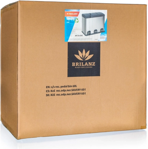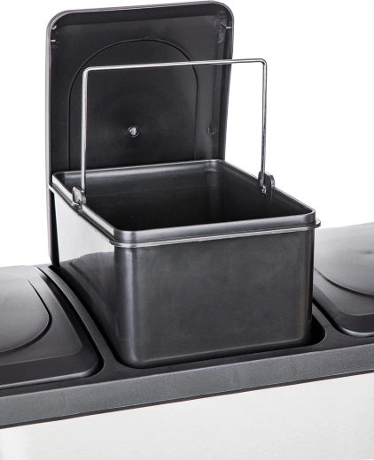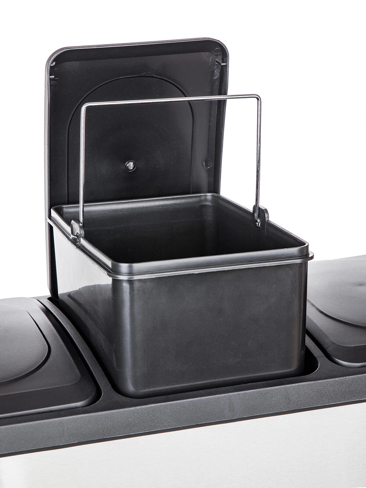 Praktisk sorteringsspand med et volumen på 60 l (3×20 l) af robust rustfrit stål med pedalåbning for maksimal hygiejne. Tre separate kamre muliggør nem affaldssortering i køkken, på kontor og i hjemmet. De indvendige spande er aftagelige for nem tømning og rengøring.