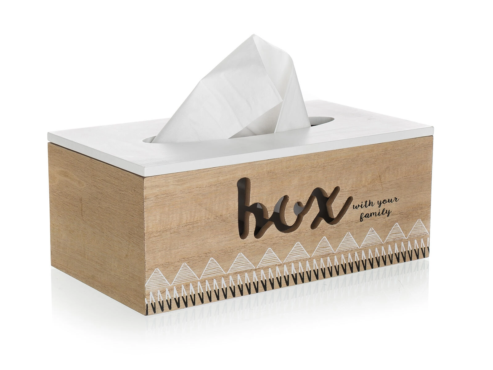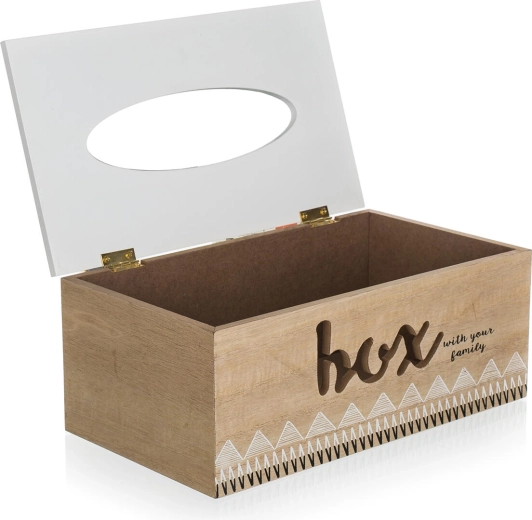 Denne FAMILY-lommetørklædeboks bringer et rent og moderne udtryk ind i enhver indretning. Det naturlige trækorpus suppleres af en hvid top med ovalt udskæringshul for glat udtrækning af lommetørklæder, mens forsiden prydes af en diskret tekst og et geometrisk mønster. Takket være de kompakte mål passer den til bord, kommode og badeværelse.