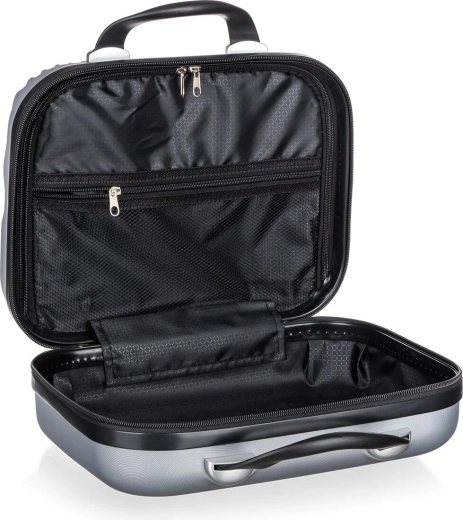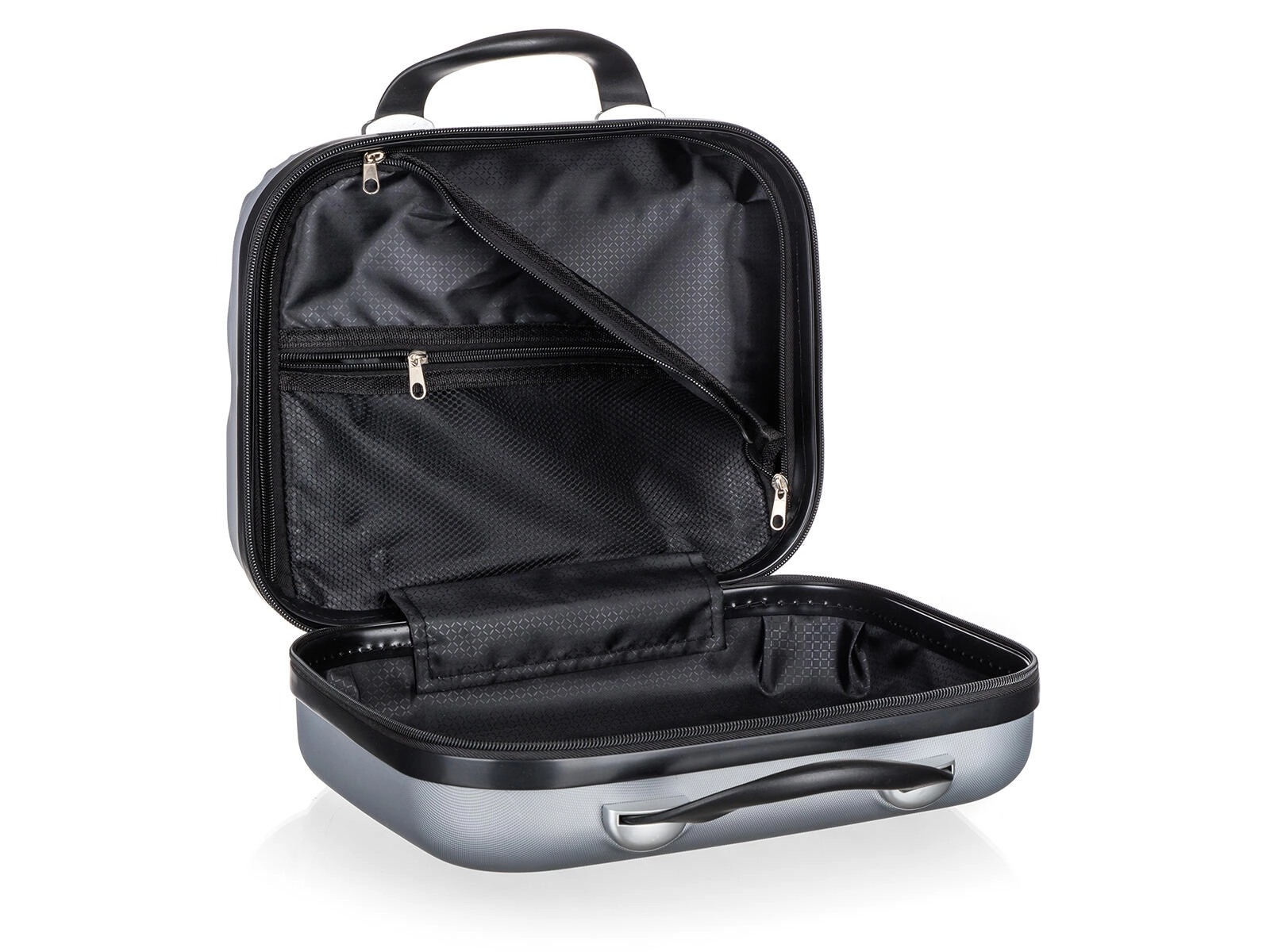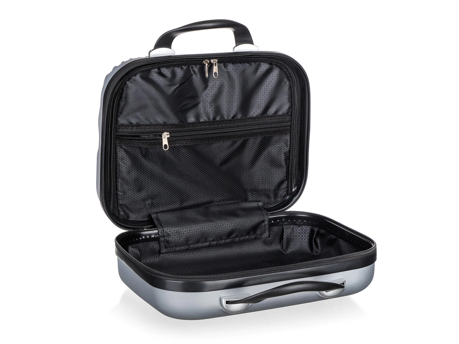 Stilren og praktisk grå rejsekuffert i størrelse 17" kombinerer en let konstruktion med en robust ABS-hardcase, der pålideligt beskytter indholdet under transport. Takket være de kompakte mål fungerer den perfekt som kosmetik- eller håndbagageorganizer.