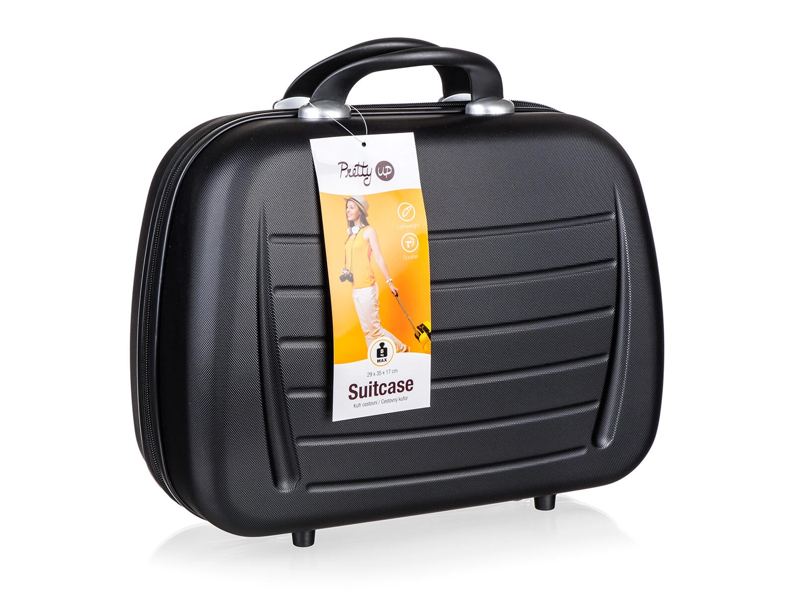 Kompakt rejsekosmetikkuffert i slidstærk ABS-plast med 15 l plads til kosmetik og tilbehør. Har hårdt skaldesign, praktisk lynlåslukning, øvre bærehåndtag og en gennemtænkt indvendig organisering for overskuelig pakning.