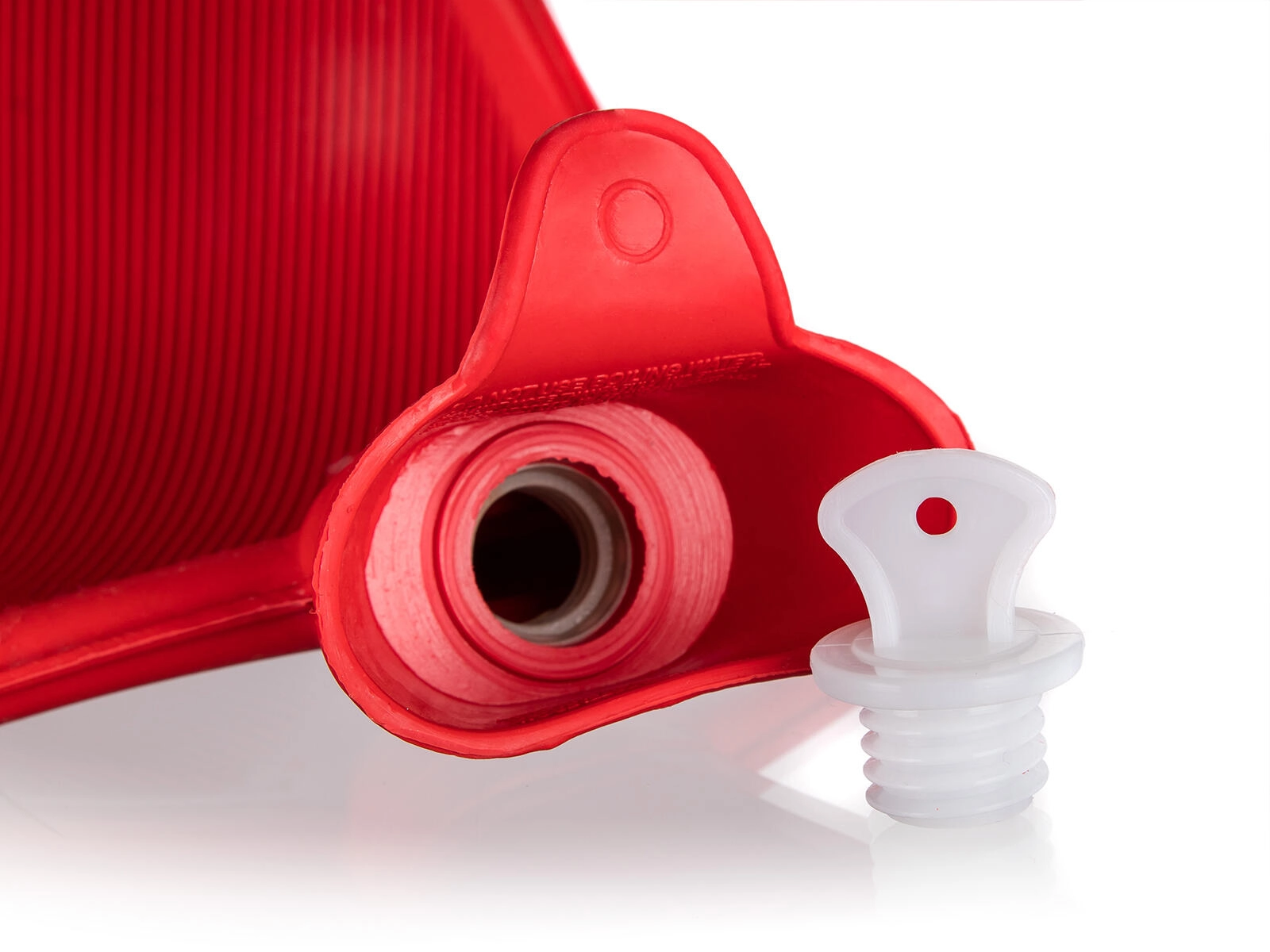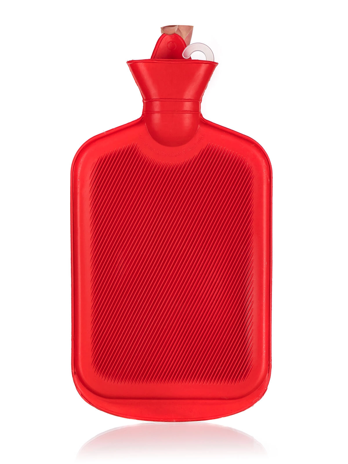 Den kvalitetsrige røde gummiflaske med rillet overflade sikrer bedre varmedistribution og et sikkert greb under brug.