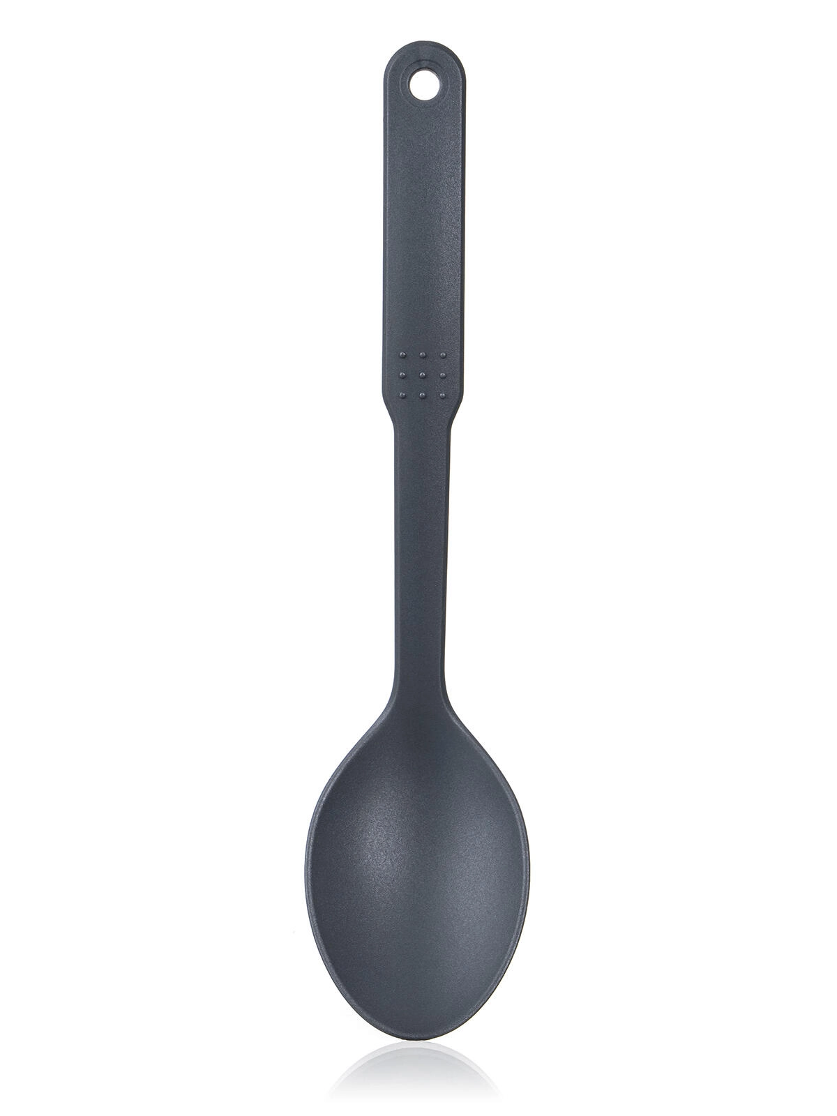 Ergonomisk håndtag med tekstur for sikkert greb og et øje, så skeen nemt kan hænges på en skinne.