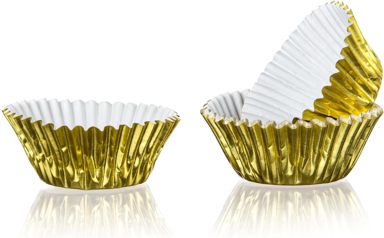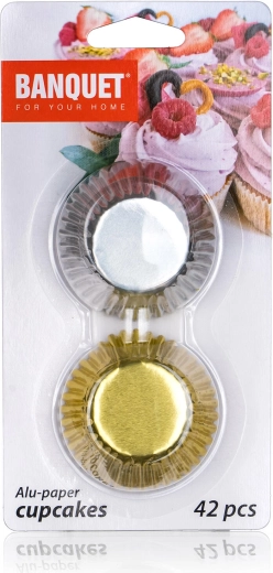 Praktisk sæt med 42 aluminiums-bageforme fra CULINARIA i guld- og sølvfarve, ideelt til bagning af mini-muffins, små forme med fyld og fremstilling af chokoladepraliner. De holdbare forme med let frigivelse og elegant udseende sikrer pæn præsentation og nem oprydning.