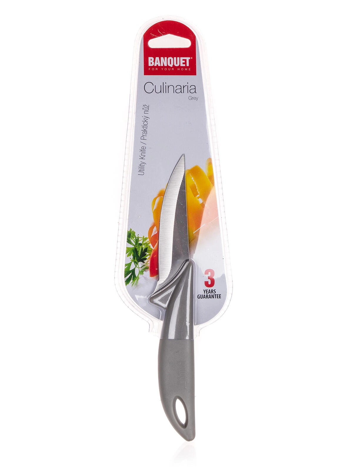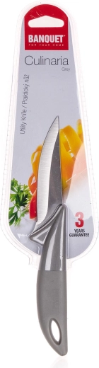 Kniven CULINARIA Grey er designet til alsidig brug i det daglige køkken. Dens 9 cm stålklinge sikrer præcise og rene snit, mens det lette og behagelige greb takket være plasthåndtaget reducerer træthed under arbejdet. Takket være de kompakte mål er den perfekt til at skrælle, skære frugt og grøntsager samt fin portionering.