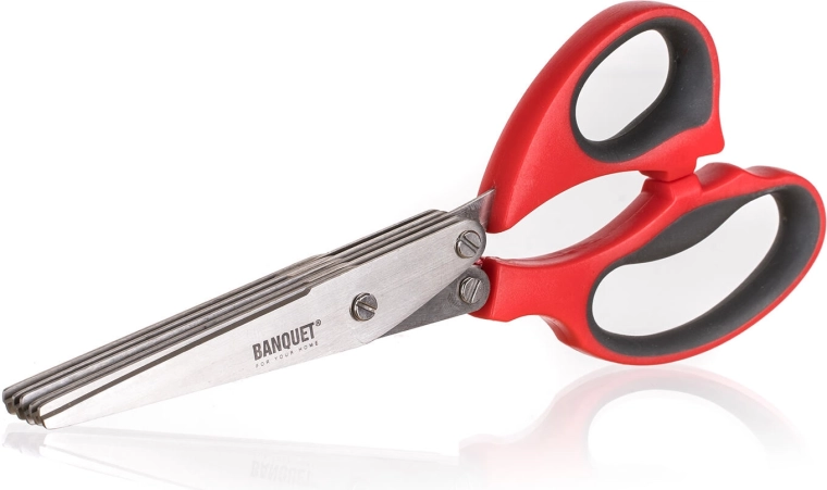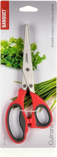 Praktisk Culinaria-urtesaks med længde på 21 cm, som forenkler madlavningen takket være flere parallelle blade, der sikrer hurtig og jævn klipning. De komfortable ergonomiske håndtag af holdbar plast i rød farve giver et sikkert greb og nem brug direkte over tallerkenen eller i skålen.
