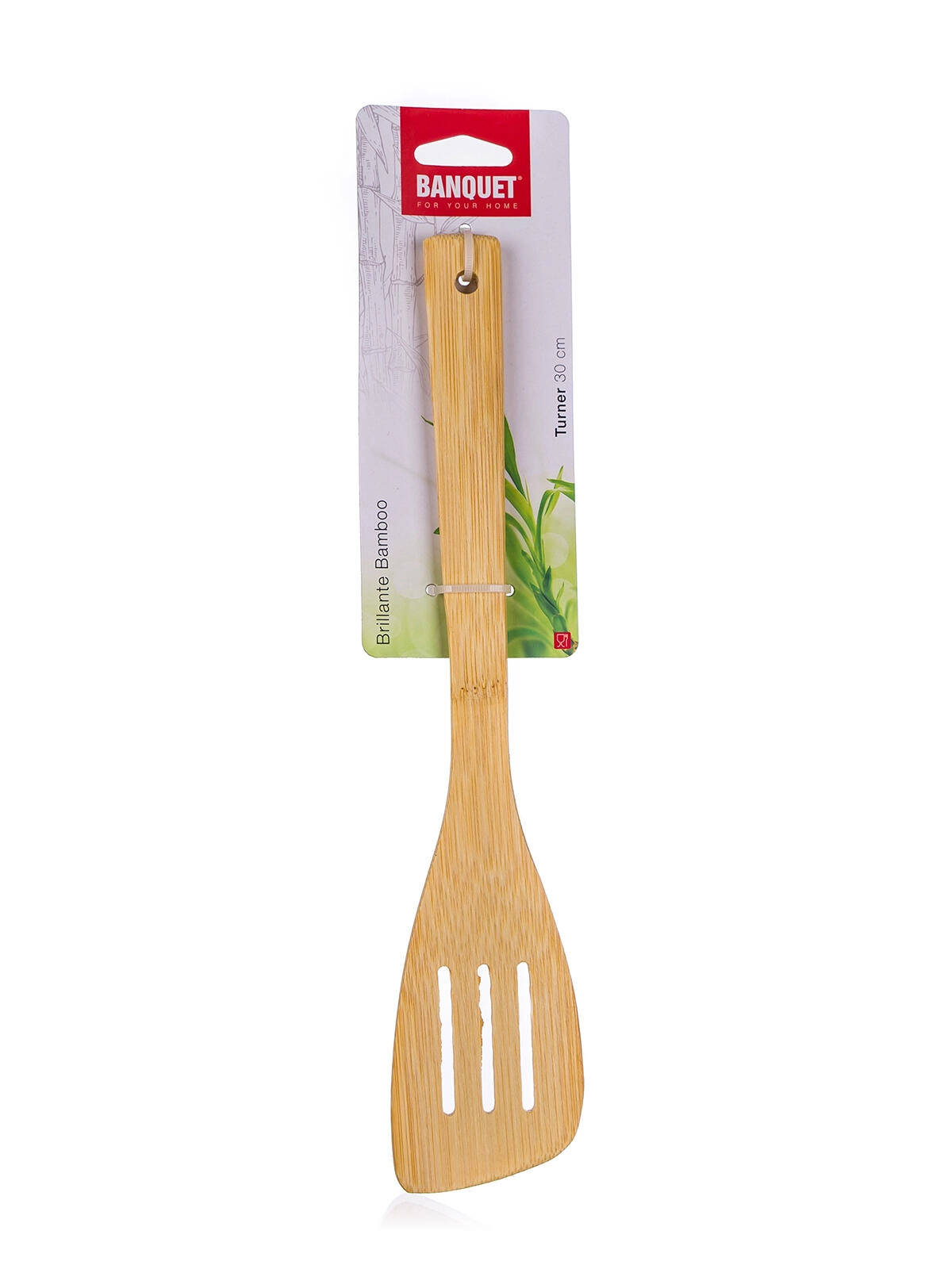 Praktisk køkkenspatel af bambustræ med en længde på 30 cm, ideel til hverdagens madlavning. Takket være det naturlige materiale er den skånsom mod køkkengrej og nem at vedligeholde. Let, holdbar og skånsom mod non-stick-overflader med et praktisk øje til ophæng for nem opbevaring.
