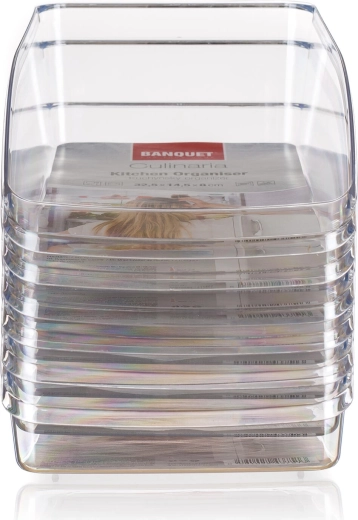 Denne alsidige organizer til køleskabet hjælper med effektivt at sortere madvarer, drikke og små ingredienser. Takket være de klare sider kan du altid se, hvad der er indeni, og nemmere holde køleskabet rent og velorganiseret. De lige sider understøtter pladsbesparende stabling ved siden af og oven på hinanden.