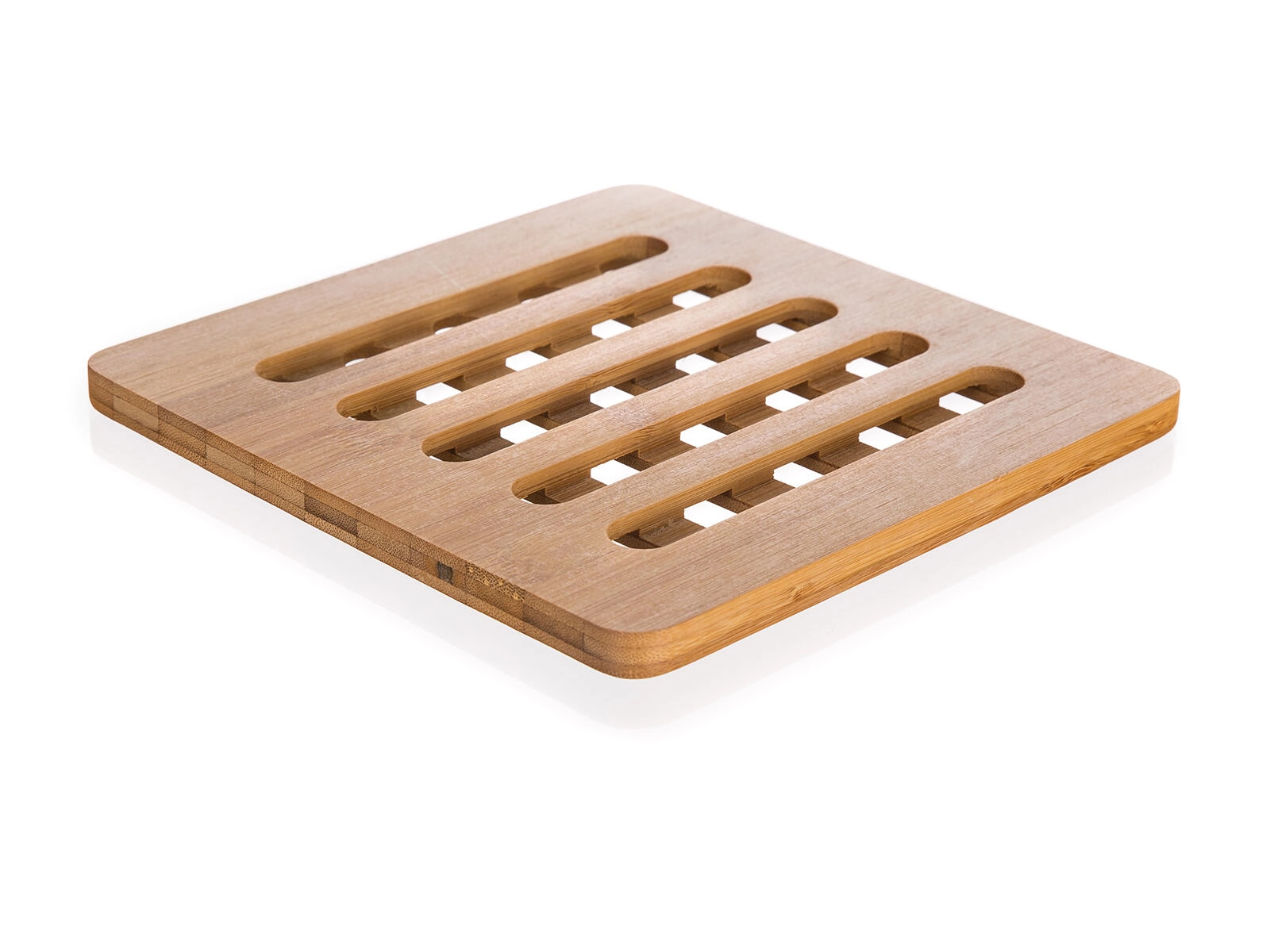 Den praktiske bambus-bordskåner BRILLANTE i målene 16 × 16 × 1 cm beskytter bordplader og borde mod varme og ridser. Takket være ventilationsåbninger sikrer den hurtig varmeafledning, er let og holdbar, fremstillet af naturlig bambus, og egner sig til varme og kolde retter og drikke.