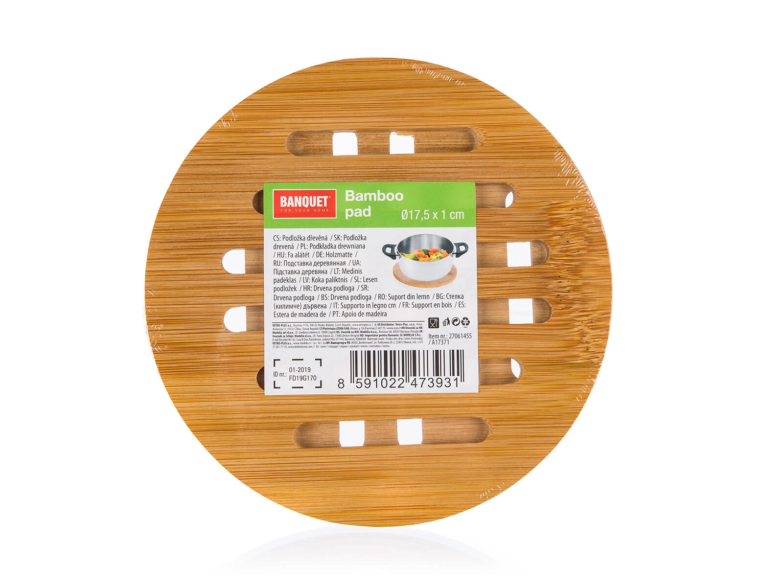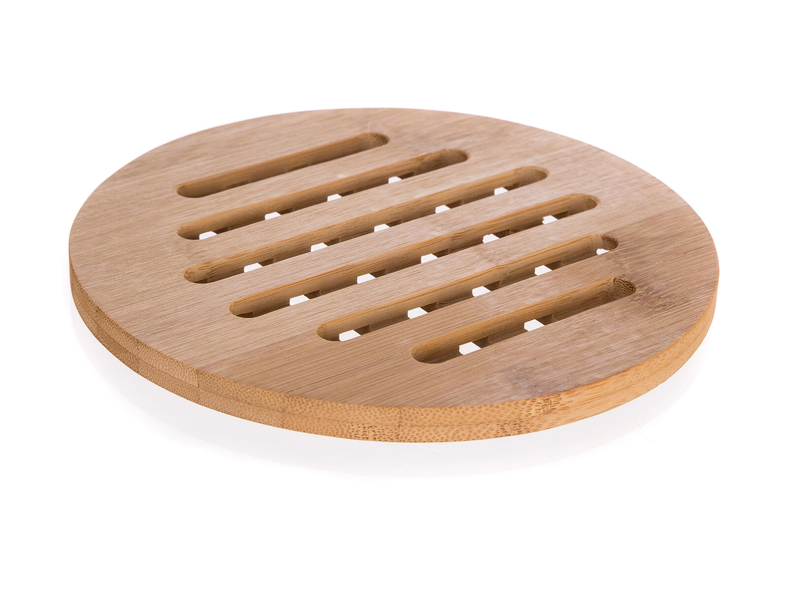 Bambusunderlag BRILLANTE med en diameter på 17,5 cm beskytter pålideligt bordet og køkkenbordet mod varme og ridser. Det er lavet af holdbar bambus, har en højde på 1 cm for bedre isolering og egner sig til varme og kolde retter og drikke.