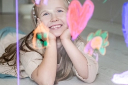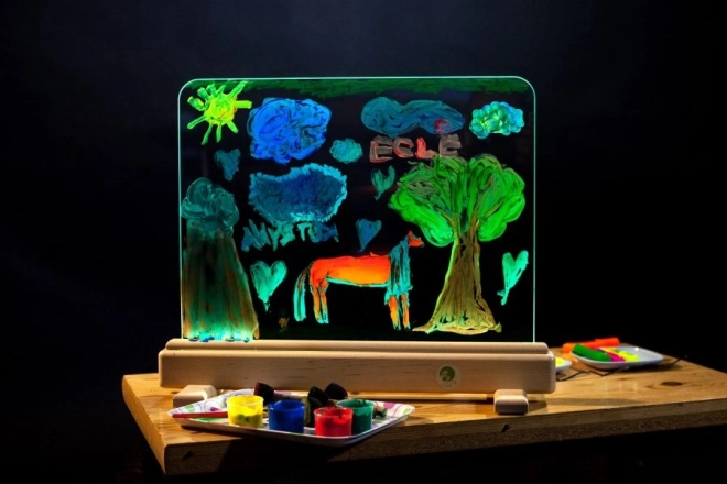 Den robuste plade af hærdet glas tåler børns begejstring og lader dem male med vandfarver, fingre og afvaskelige tuscher. Der kan tegnes på begge sider, så børn kan skiftes eller skabe sammen.