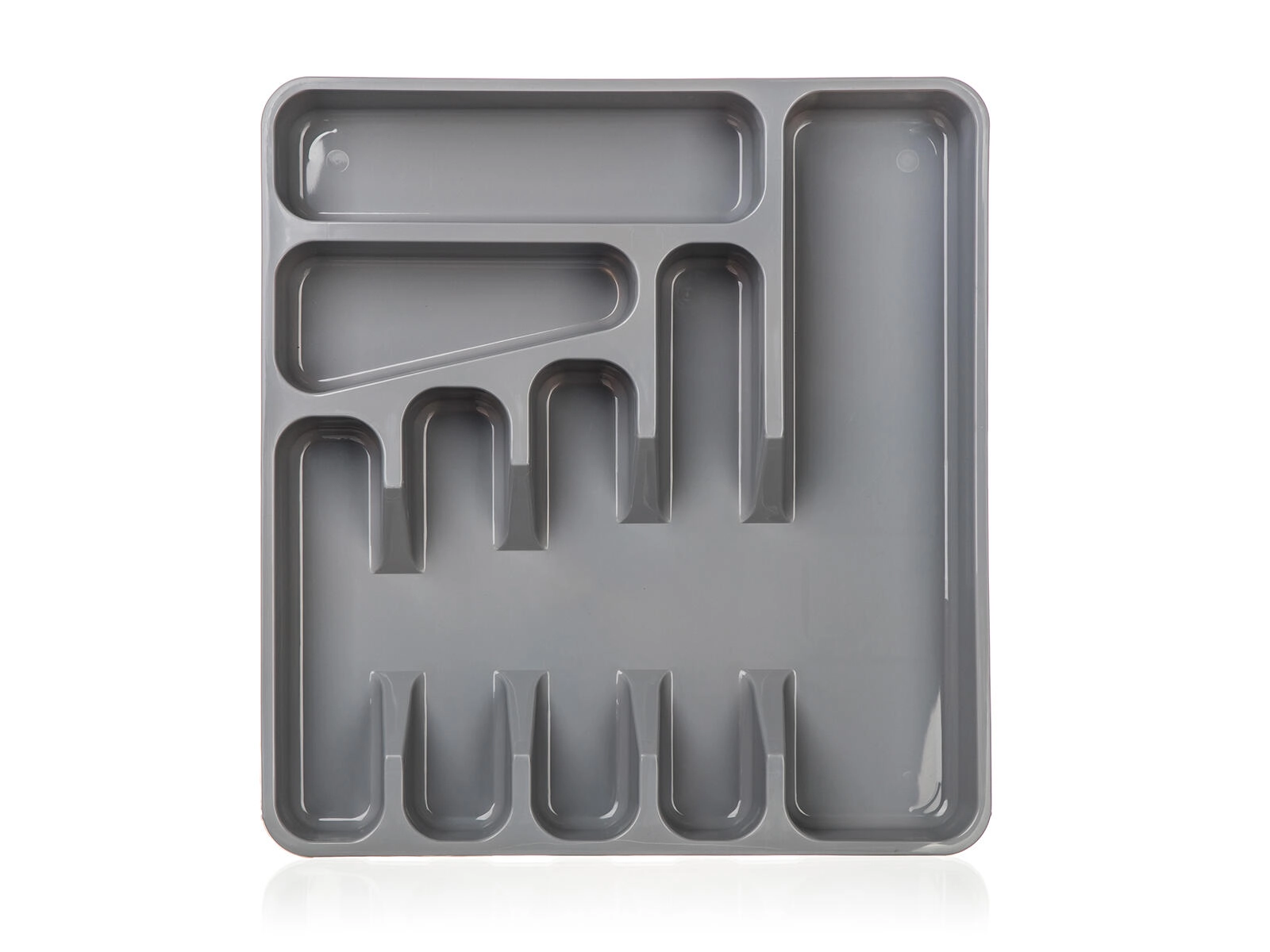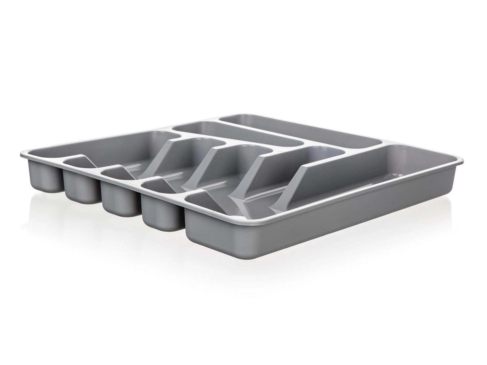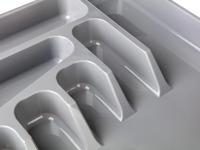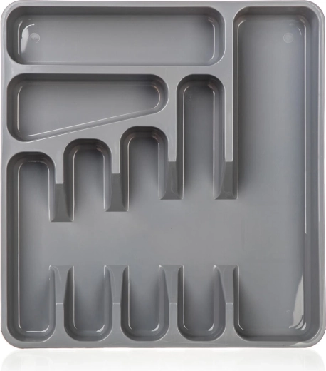 Den grå bestikbakke i kvalitetsplast er en praktisk løsning til overskuelig opbevaring af bestik og småt køkkenudstyr. Takket være den gennemtænkte ruminddeling har du altid gafler, knive, skeer og små redskaber lige ved hånden og på deres faste plads.