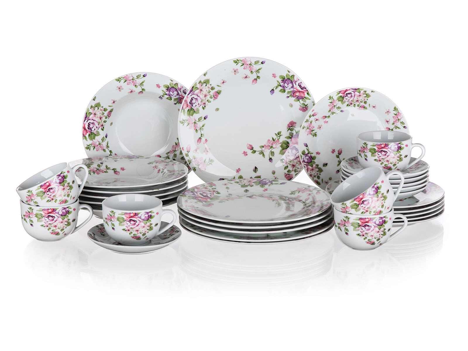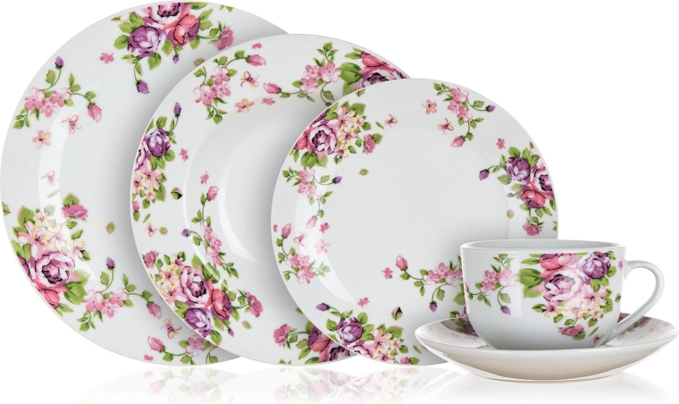 Sættet indeholder 30 dele: 6 dybe, 6 flade og 6 desserttallerkener, 6 underkopper og 6 kopper med volumen 220 ml – ideelt til både hverdag og fest.