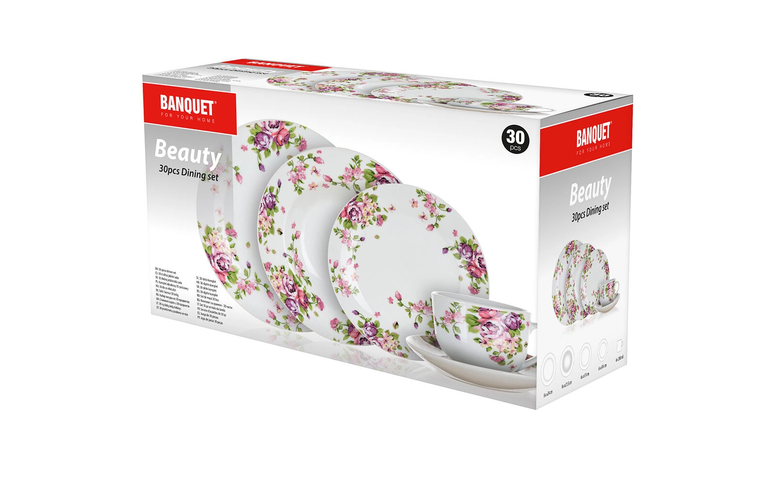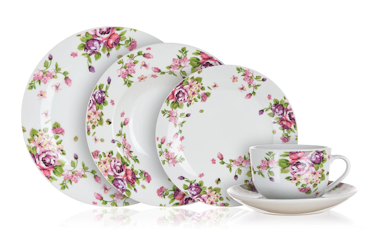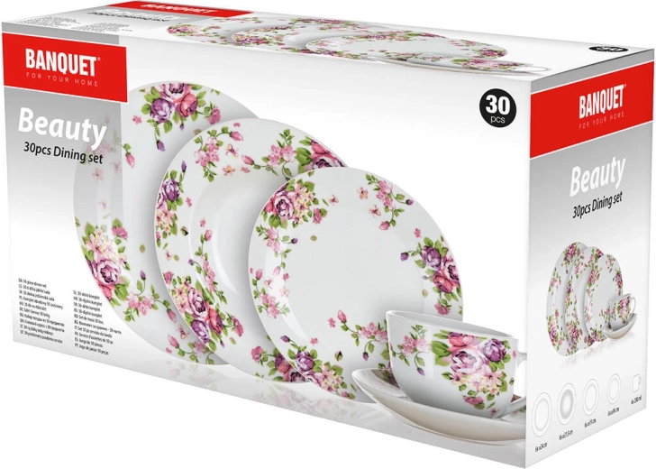 Det stilfulde Beauty-stel kombinerer klassisk hvidt porcelæn med et romantisk blomstermotiv, der matcher på tværs af alle dele. Med den gennemtænkte sammensætning får du tallerkener til supper, hovedretter og desserter, suppleret af kopper med underkopper til servering af kaffe eller te.