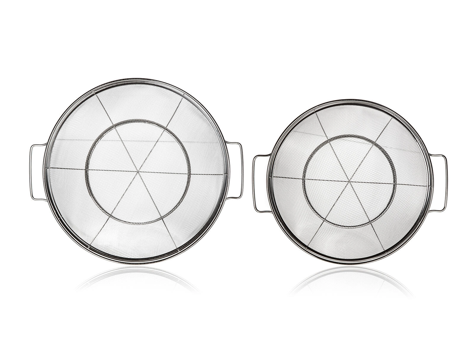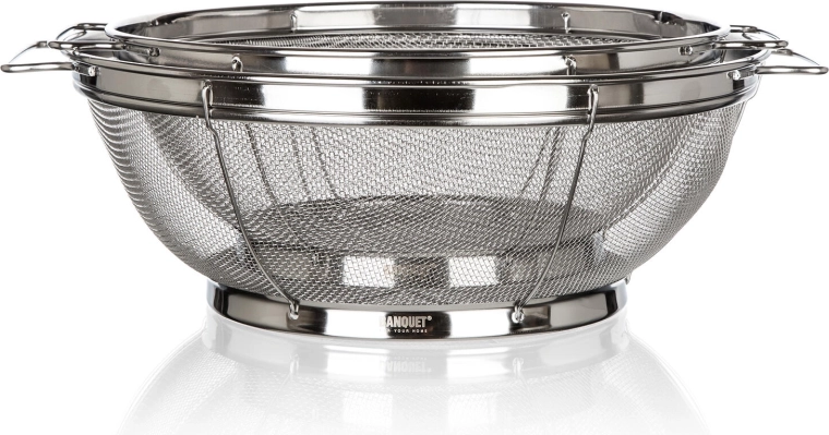 Sættet med netsier af rustfrit stål med sokkel AKCENT kombinerer holdbarhed, stabilitet og effektiv siing. Det fine net fanger pålideligt selv små stykker, mens den forhøjede ringformede sokkel holder sien over bunden af vasken eller arbejdsfladen, så maden forbliver ren og uden kontakt med vand.