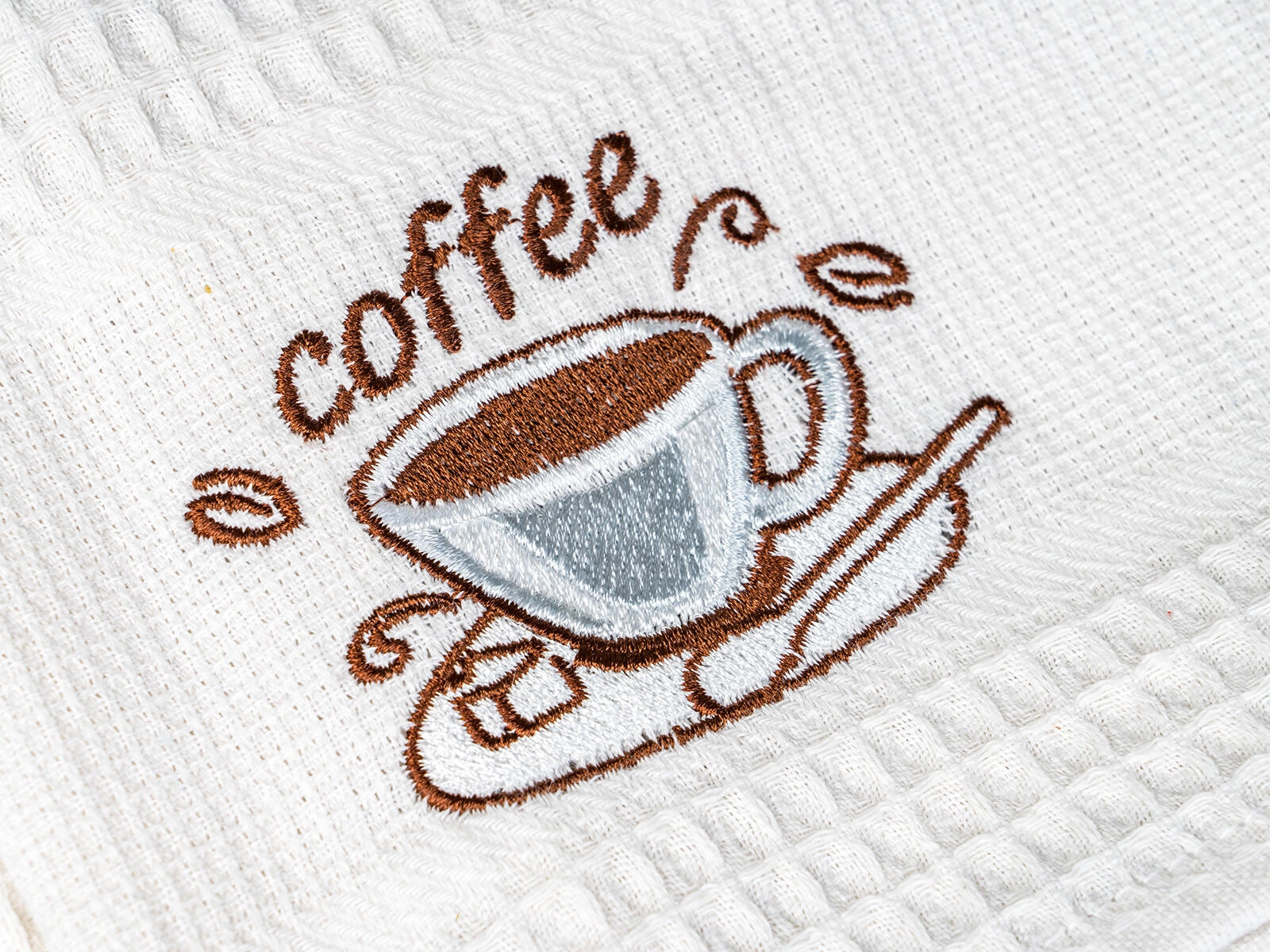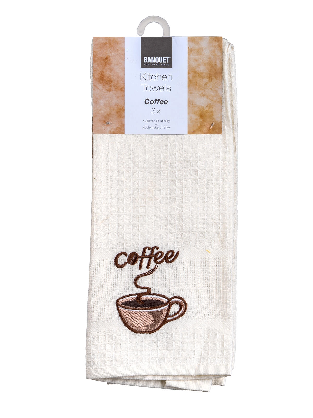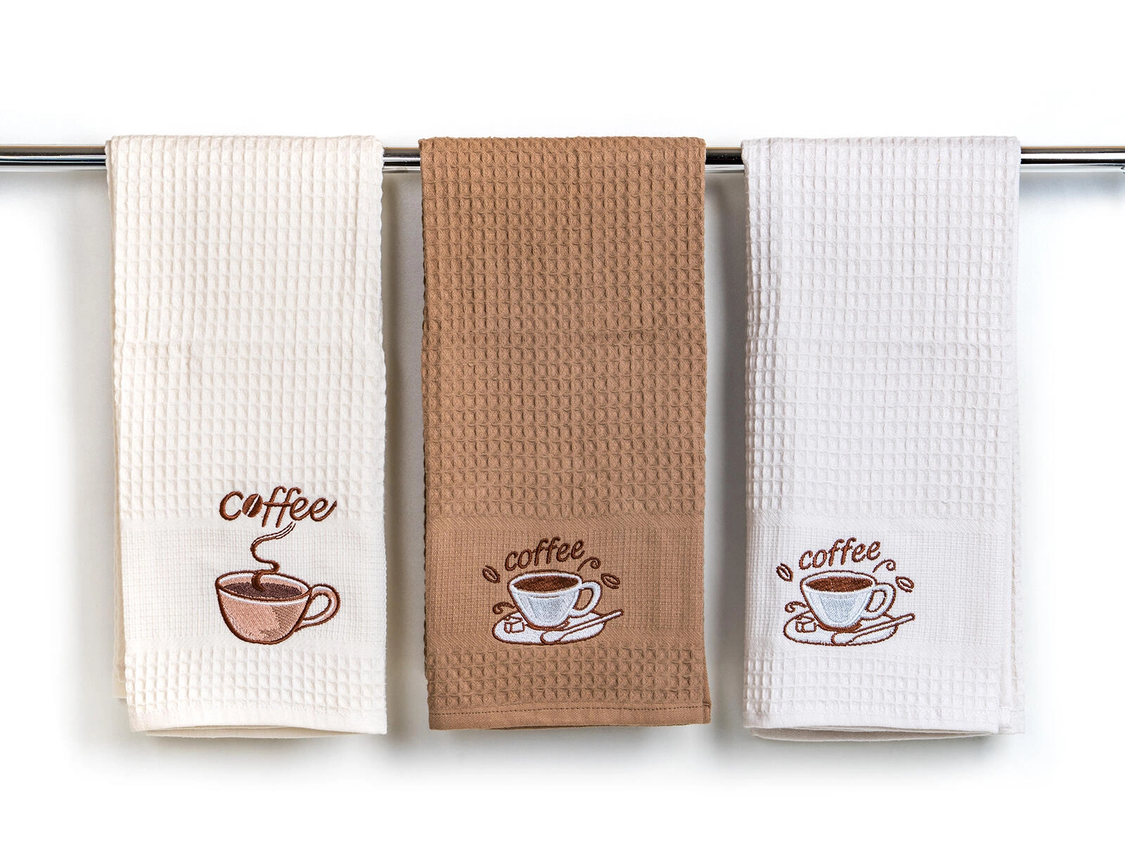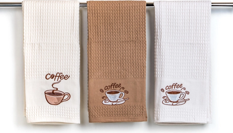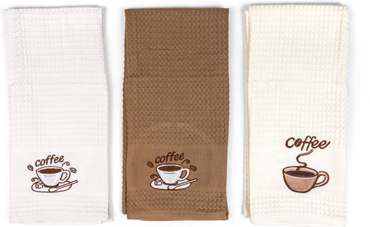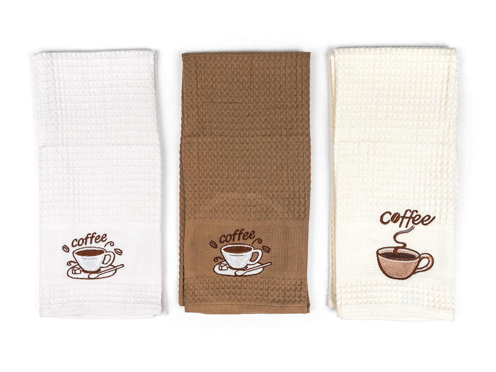 Dekorativ coffee-brodering giver køkkenet et stilfuldt touch. Sæt med tre styk i hvide, creme- og beige nuancer passer ind i enhver indretning.