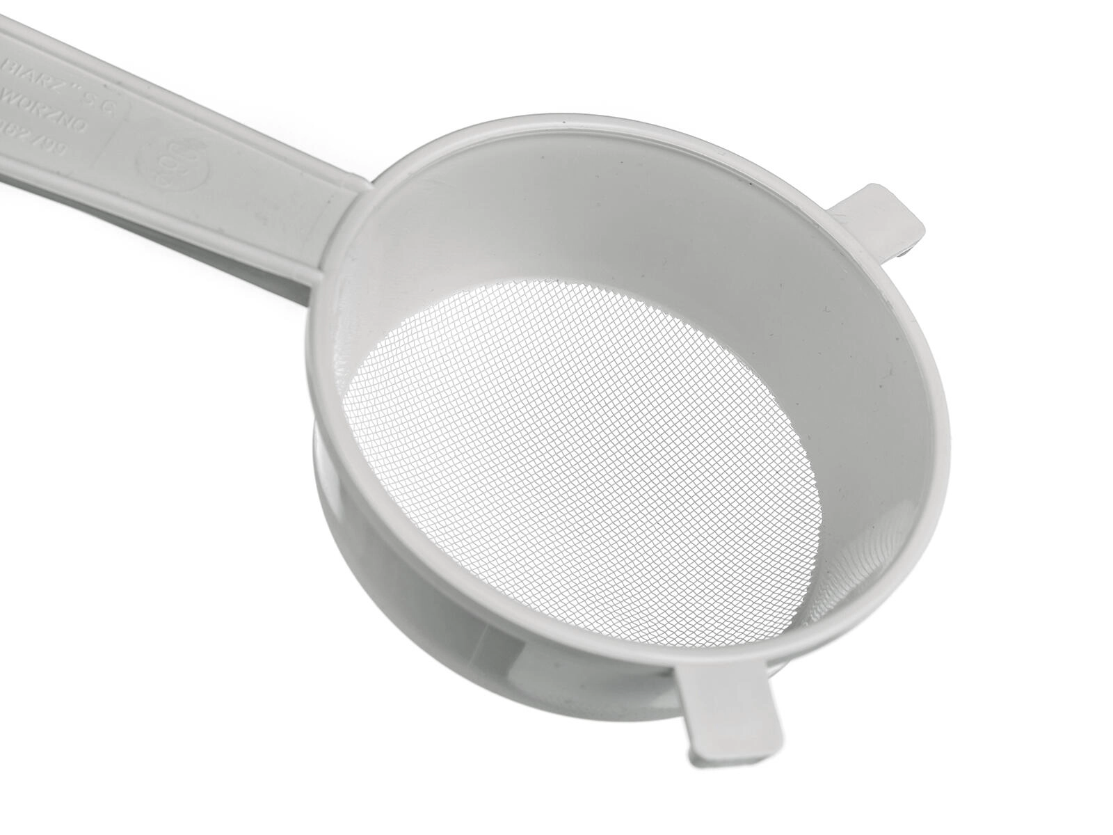 Praktisk køkkensi PRAKTIS med en diameter på 9 cm i elegant hvid farve er ideel til daglig siing og sigtning. Takket være den lette plastkonstruktion og det fine net sikrer den hurtig og ren filtrering af bouilloner, saucer og te. Det komfortable håndtag og støtteører muliggør stabil placering på skål eller gryde og nem håndtering.