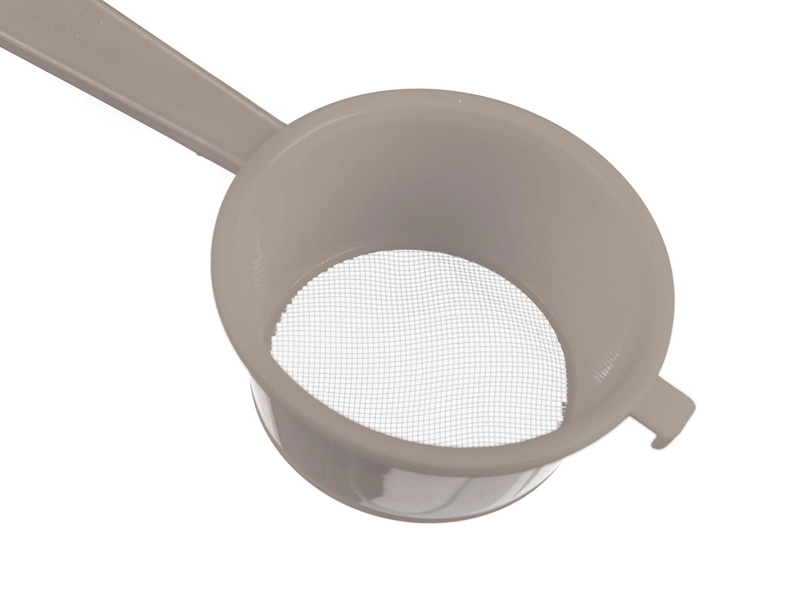 Praktisk køkkensi PRAKTIS med en diameter på 7,5 cm i en moderne latte-nuance er ideel til daglig madlavning og bagning. Takket være det fine net og det komfortable håndtag klarer den pålideligt sining af væsker, skylning af små ingredienser og sigten af tørre råvarer. Den lette plastkonstruktion er nem at rengøre og holdbar til almindelig brug i hjemmet.
