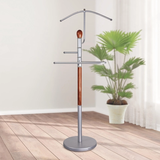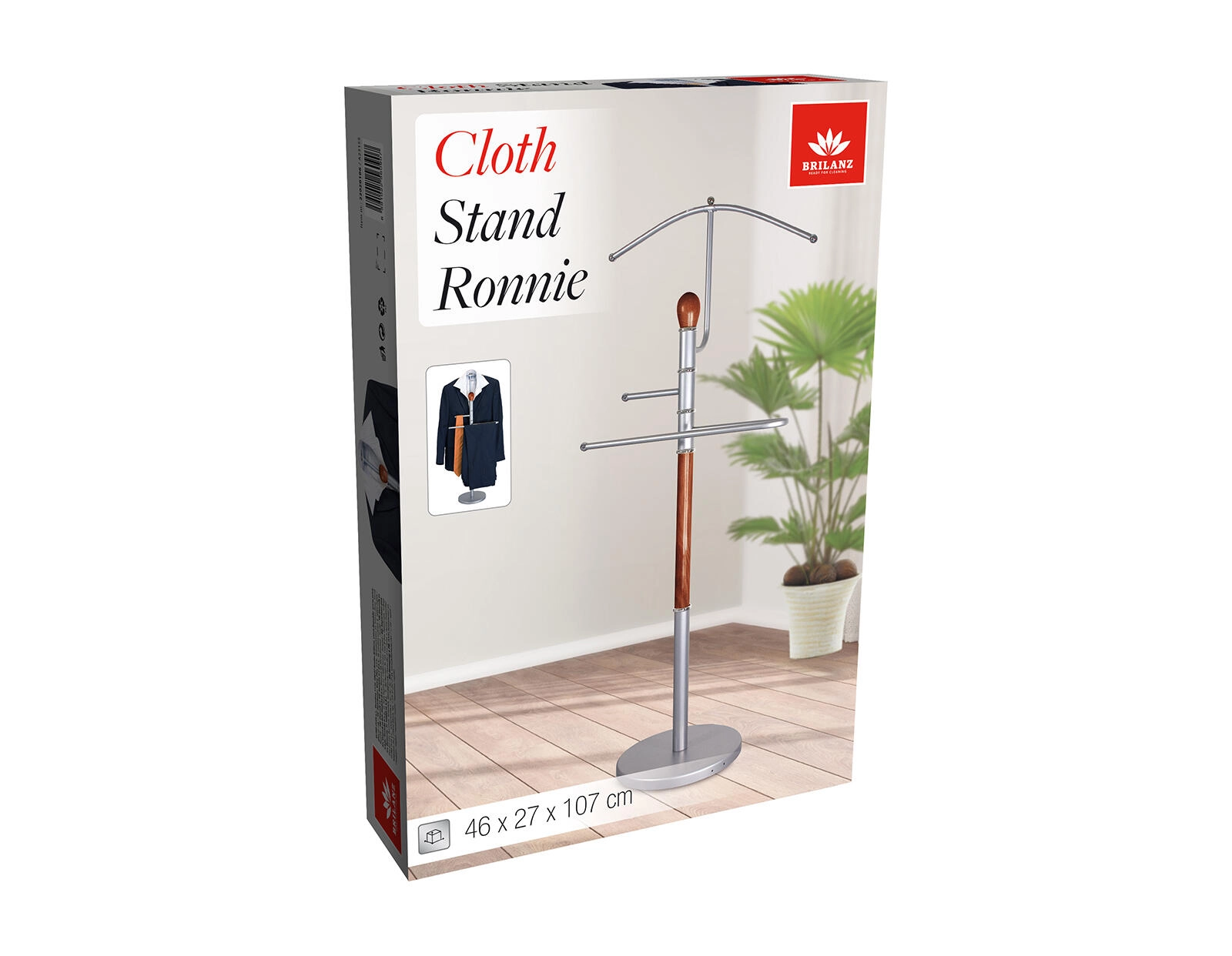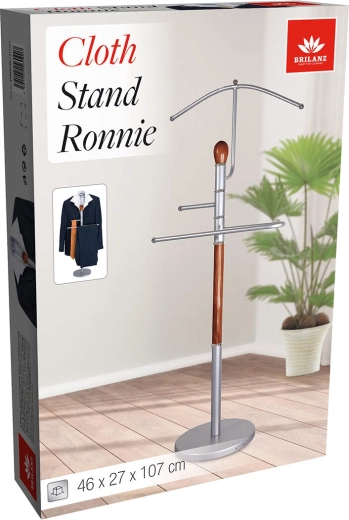 Tjenerstativet RONNIE er det ideelle tilbehør til soveværelse, garderobe eller entré. Det udmærker sig ved kombinationen af mat krom og kvalitetstræ i en brun nuance, som giver indretningen et både moderne og tidløst udtryk. Den praktiske konstruktion gør det muligt at hænge forskellige stykker tøj, så de forbliver uden krøller og altid klar til brug.