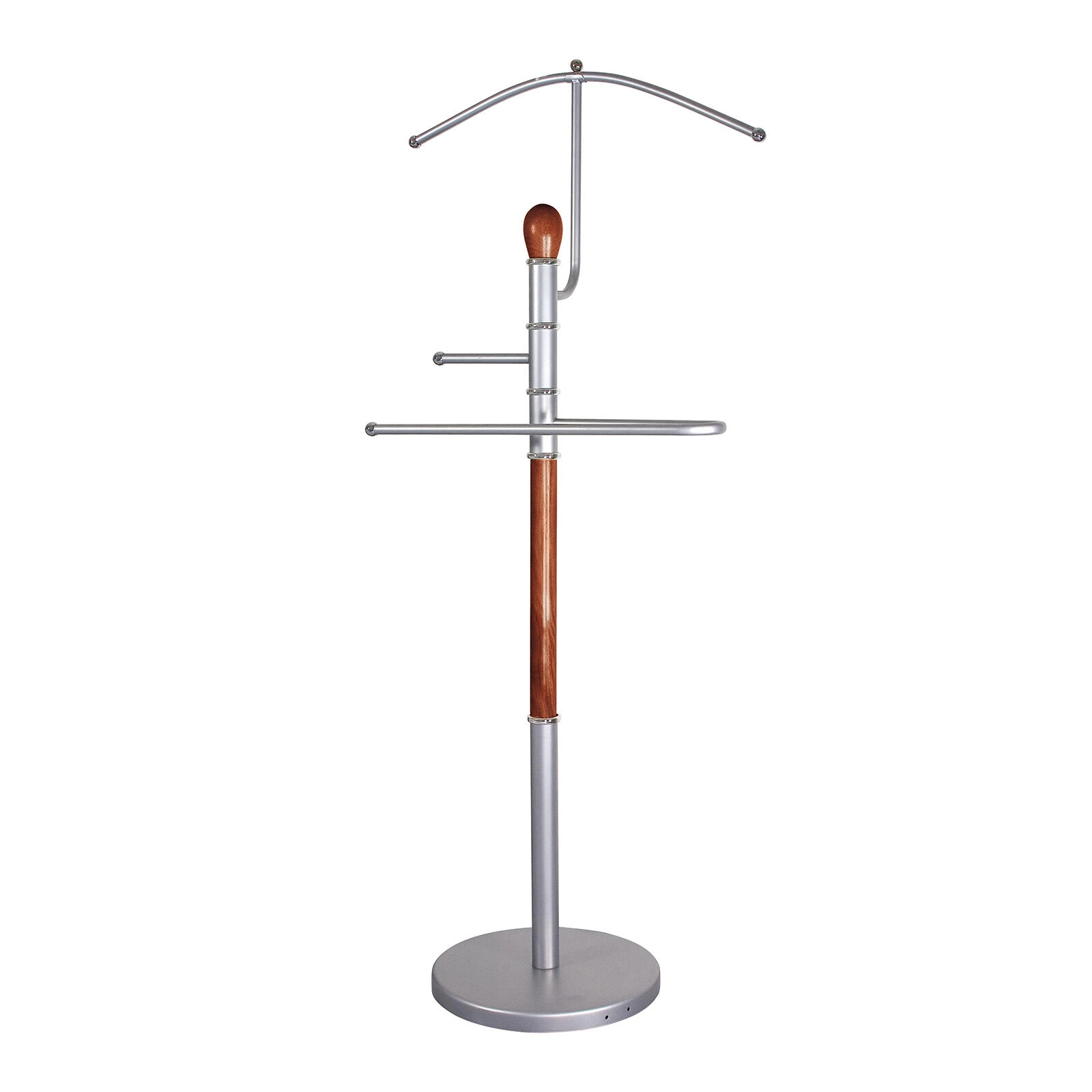 Det elegante tjenerstativ RONNIE kombinerer mat krom og naturligt træ i mellembrun farve for stilfuld og praktisk opbevaring af tøj. Takket være den stabile base og en højde på 107 cm holder det skjorter, jakker og bukser pænt organiseret og lige ved hånden.