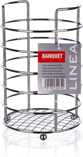 Praktisk trådstativ til køkkenredskaber LINEA af forkromet stål holder dine skeer og øser overskueligt samlet ét sted. De kompakte mål (diameter 11 cm, højde 17,5 cm) sparer plads på køkkenbordet, og den holdbare udførelse sikrer lang levetid.