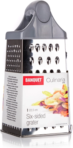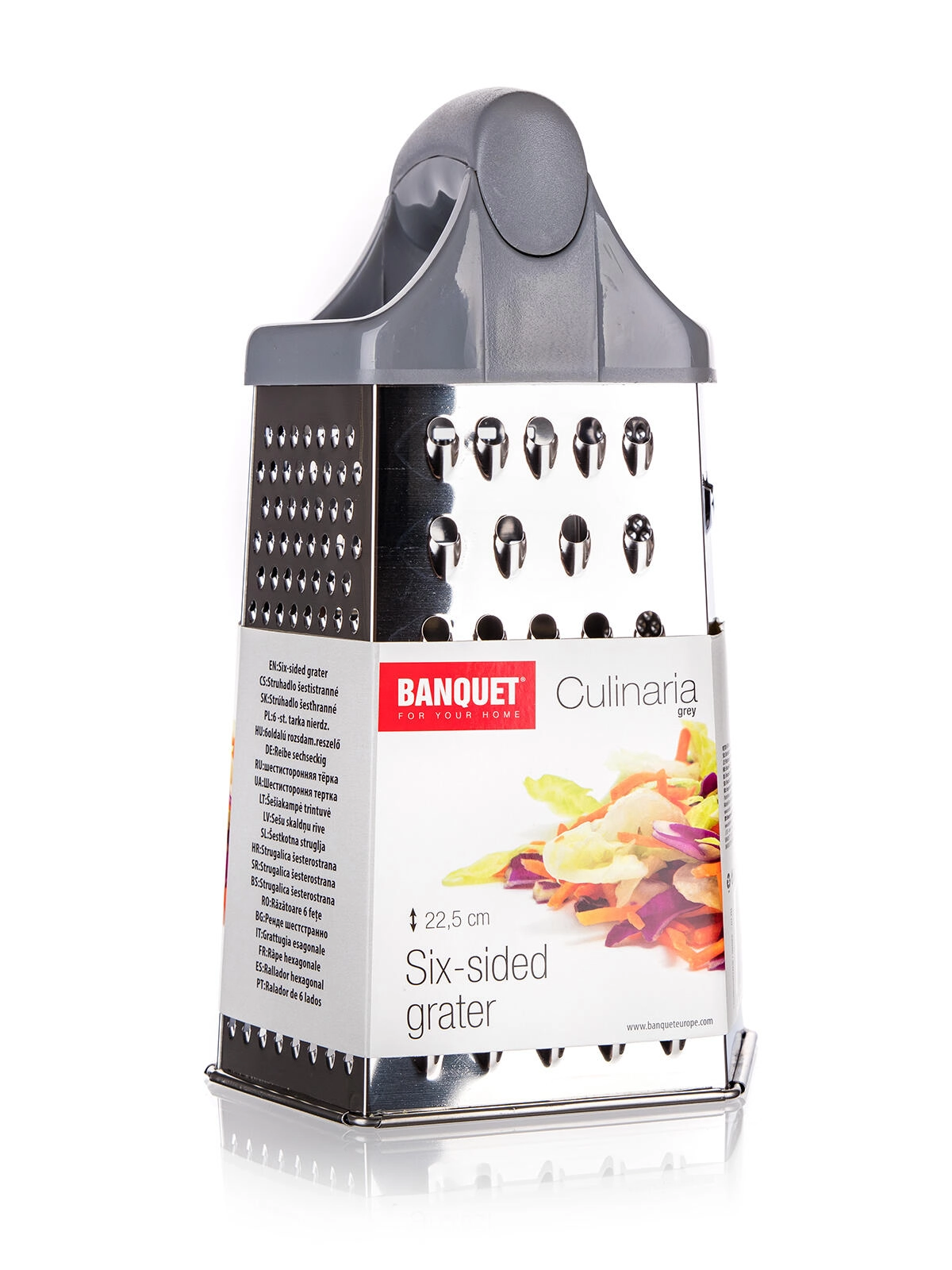 Opdag en alsidig hjælper i køkkenet – det sekskantede rivejern i rustfrit stål CULINARIA Grey med en højde på 22,5 cm. Det tilbyder forskellige typer blade til fin og grov rivning, skæring og skivning, så det klarer ost, grøntsager, frugt og chokolade. Takket være den robuste konstruktion står det stabilt under arbejdet og er let at vedligeholde.