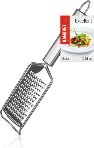 Det universelle rivejern i rustfrit stål EXCELLENT med en længde på 25 cm er en praktisk hjælper i ethvert køkken. Takket være den holdbare konstruktion i rustfrit stål, det komfortable håndtag og øje til ophæng klarer det nemt rivning af grøntsager, ost og andre råvarer. Nemt vedligehold og lang levetid gør det til et ideelt valg til daglig madlavning.